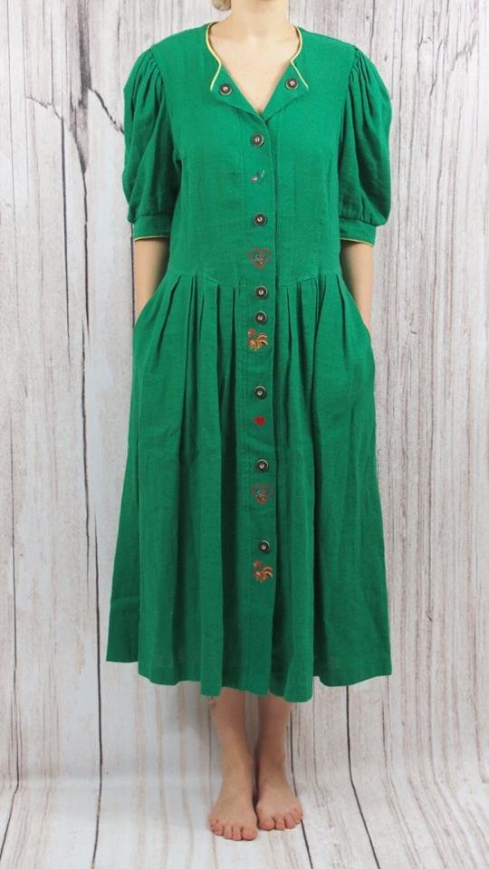 Lniana sukienka folkowa z kogucikami , kaczkami i innym wyszywanymi zdobieniami.