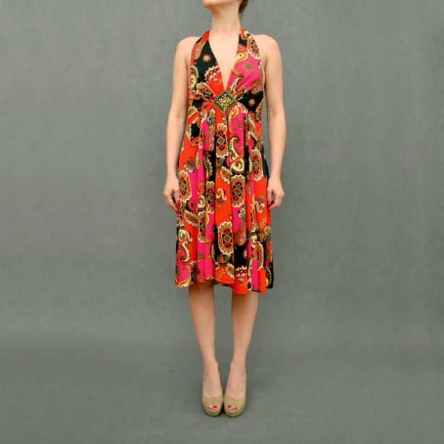 Sukienka marki H&M w ostrym pomarańczu i różu. Wzór w folkowym klimacie. Wiązana na szyi, dół luźny. Pod biustem ozdobiona naszywką. Polecam.