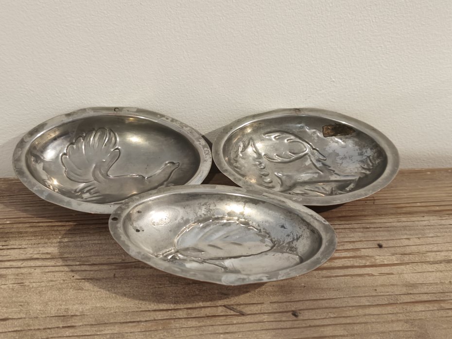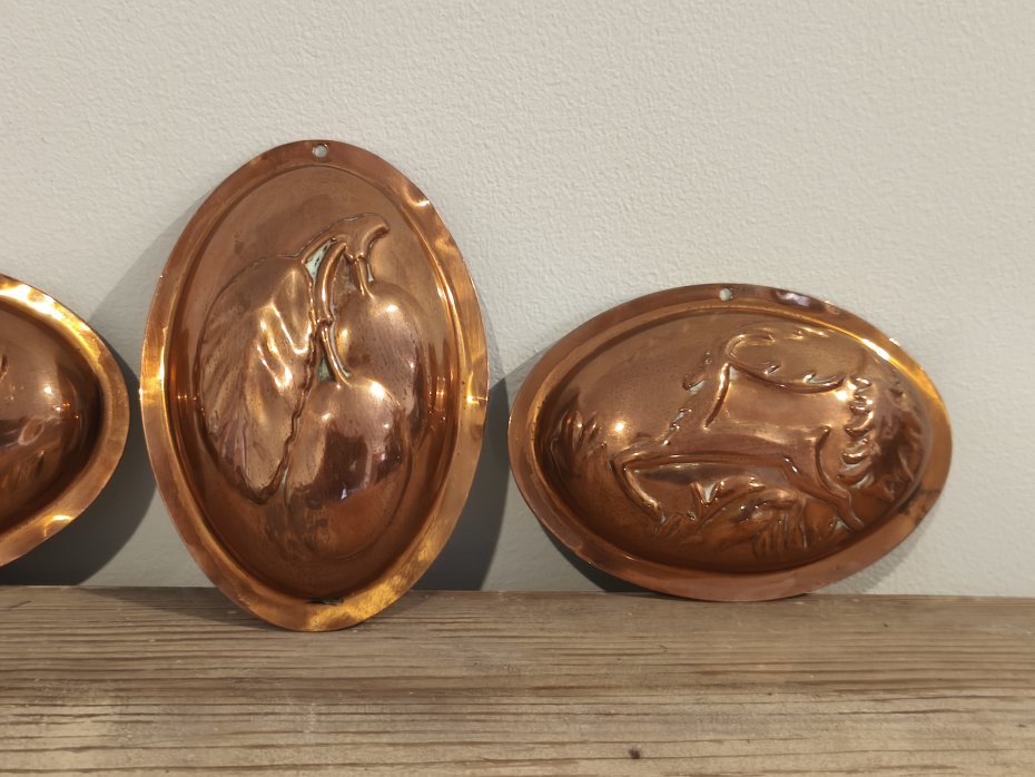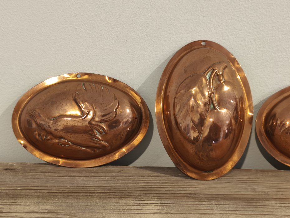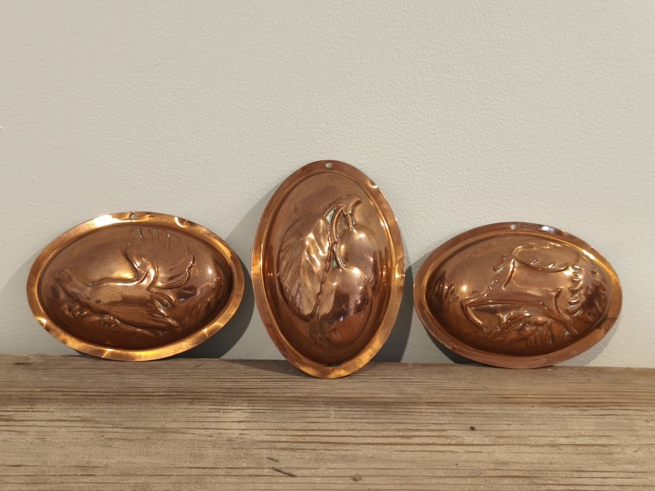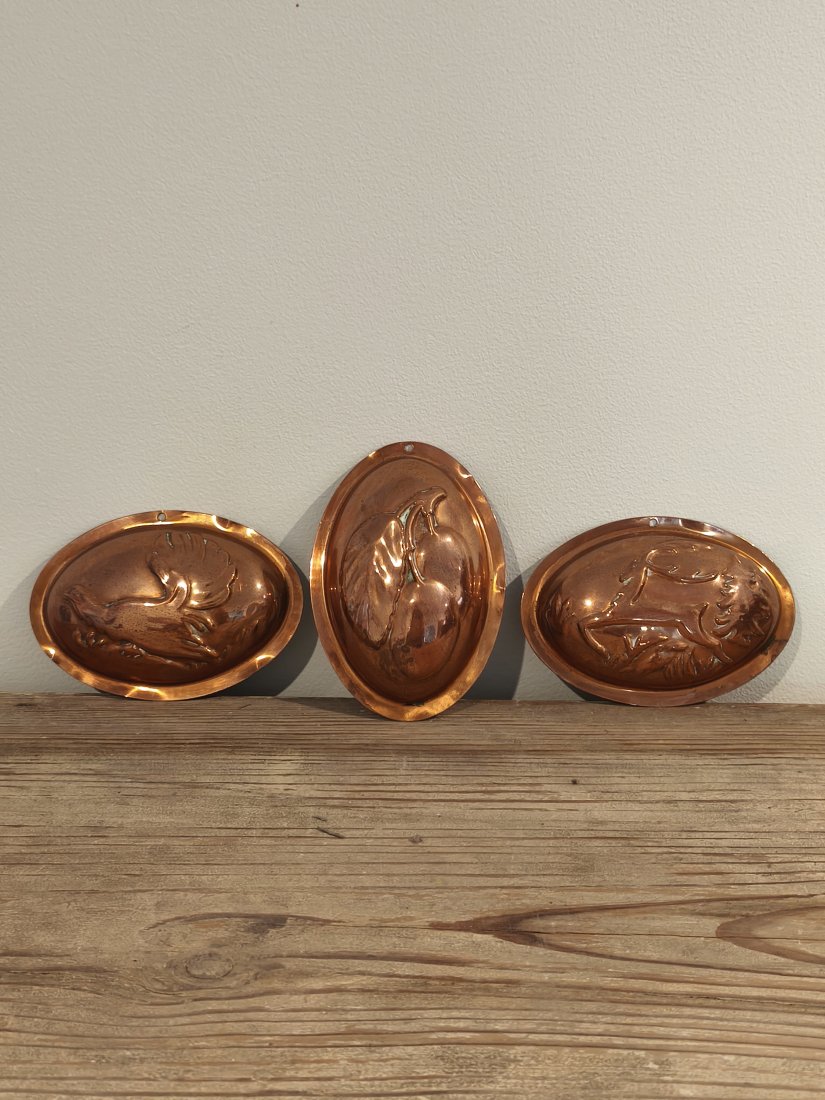 Trzy foremki miedziane do zawieszenia. Super do wystroju w stylu Vintage. Wymiar foremki to ok 7,5 / 10,5cm.