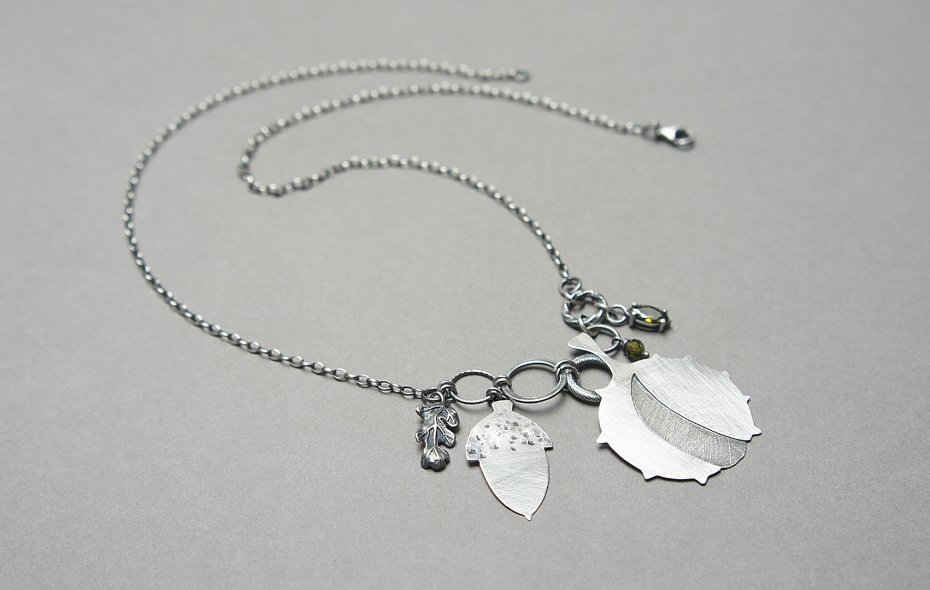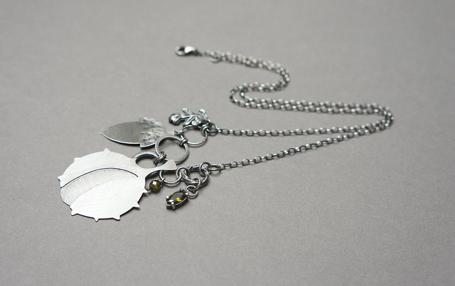 Naszyjnik wykonany ze srebra [pr. 925] w połączeniu z cyrkoniami oliwinowymi oraz srebrnymi zawieszkami. Całość oksydowana i przetarta. Długość naszyjnika około 55cm. Biżuteria ozdobnie zapakowana. Jedyny egzemplarz.