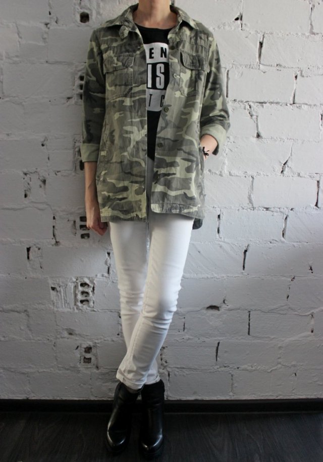 Koszula moro z kieszeniami. Firma Forever 21. Rozmiar z metki 38/M. Wymiary: obwód biustu-47cmx2 (mierzony od pachy do pachy), obwód pasa-51cmx2, obwód bioder-56cmx2, długość rękawa-66cm, długość przodu koszuli-74cm, długość tyłu koszuli-78cm. Skład materiału: 100% bawełna.