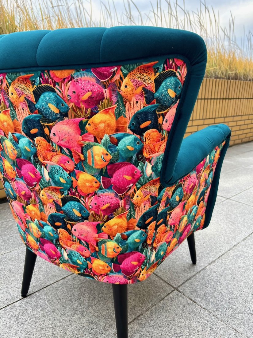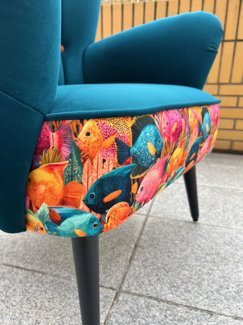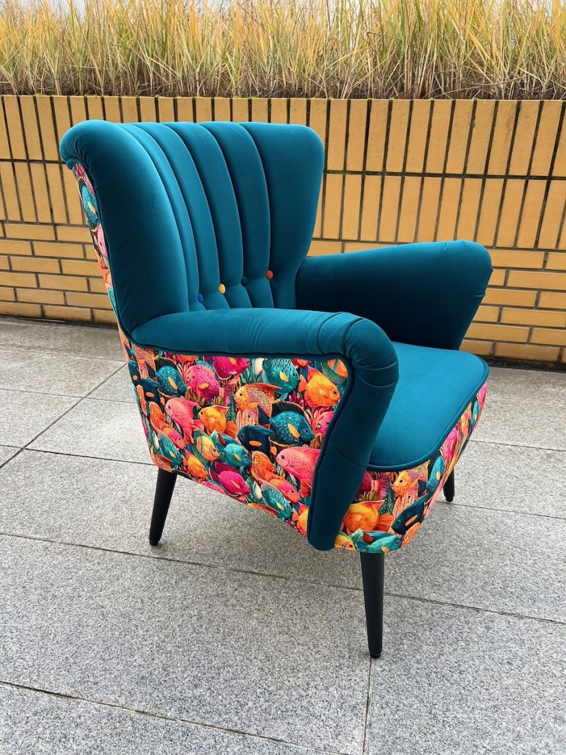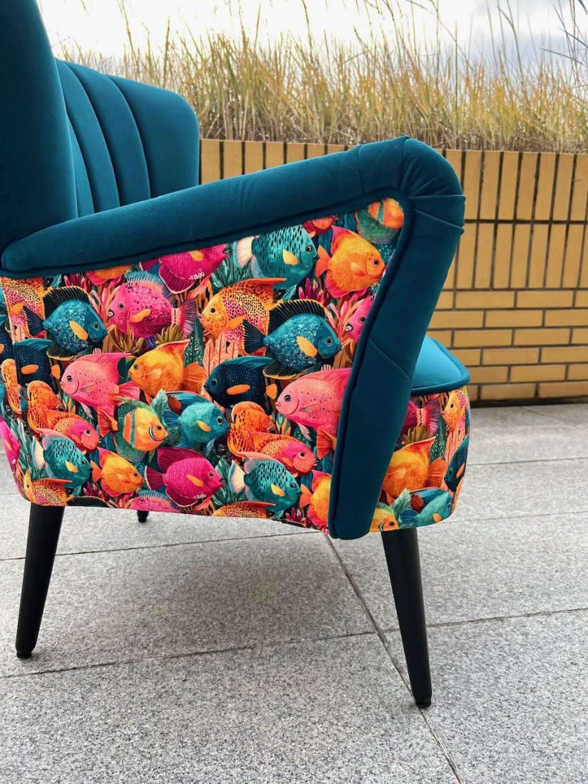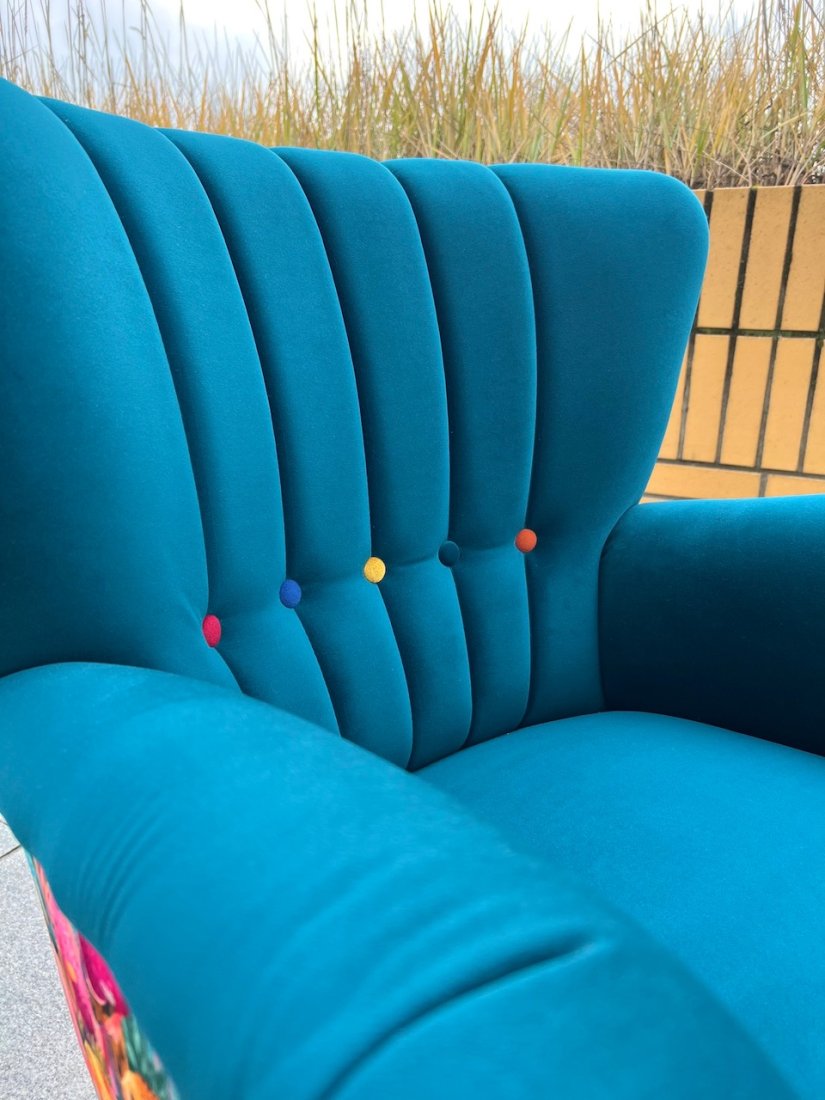 Na tyle i na boku fotela użyto welur drukowany. Na siedzisku i oparciu użyty jest gruby, przyjemny w dotyku materiał welurowy w kolorze ciemnego turkusu, stworzony w jakości Water Blocked oraz Good for Pets (ogranicza wchłanianie wody – każdy rozlany płyn formuje się w krople i nie wnika do wnętrza tkaniny oraz materiał przebadany jest pod kątem odporności na zaciągnięcia pod wpływem np. drapania). Na oparciu zastosowano pionowe przeszycia oraz kolorowe guziki. Drewno (nogi) może być wybarwione na dowolny kolor. Nogi czarne z końcówką mosiężną są dodatkowo płatne +150 zł. Istnieje możliwość wykonania sofki i podnóżka do kompletu.