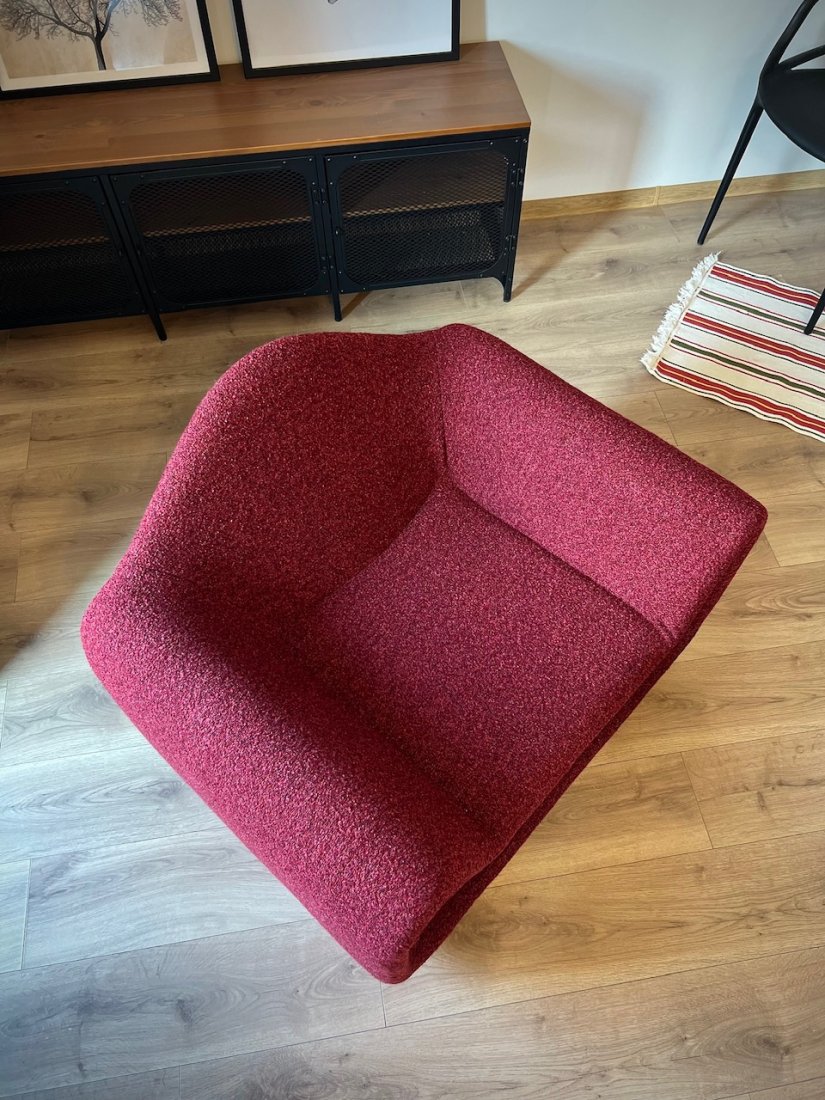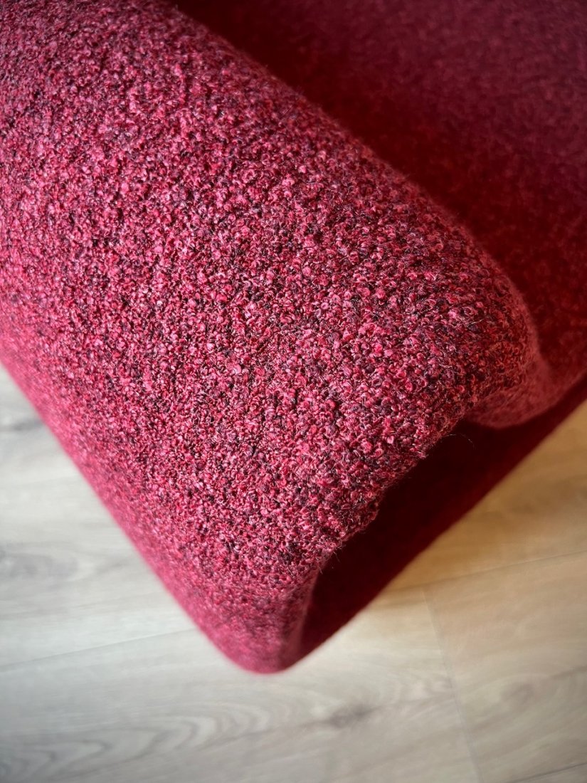 Fotel obity jest materiałem typu szenil z kolekcji Impress me w kolorze bordowym. Charakterystyczną cechą tej tkaniny są liczne pętelki oraz supełki na powierzchni tej tkaniny, które posiadają nieregularny kształt oraz wielkość. Na tkaninie dostrzec możemy bardzo ciekawą grę odcieni i przechodzących zbliżonych barw. Materiał trudnopalny.