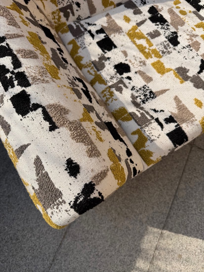 Fotel obity jest materiałem typu szenil z kolekcji Gaudi. Materiał wysokiej jakości z delikatnym efektem 3D oraz niewielką grą cieni. Splot wykonany jest z nici o podobnych odcieniach kolorystycznych co nadaje tej tkaninie bardzo ciekawego efektu wizualnego.