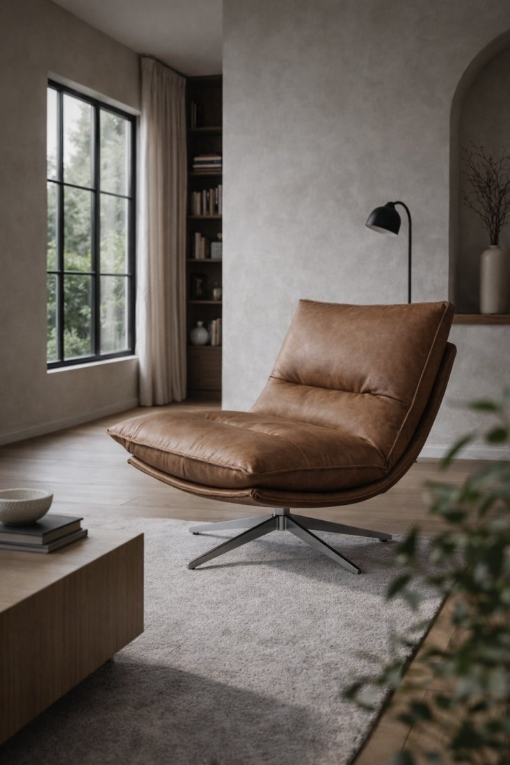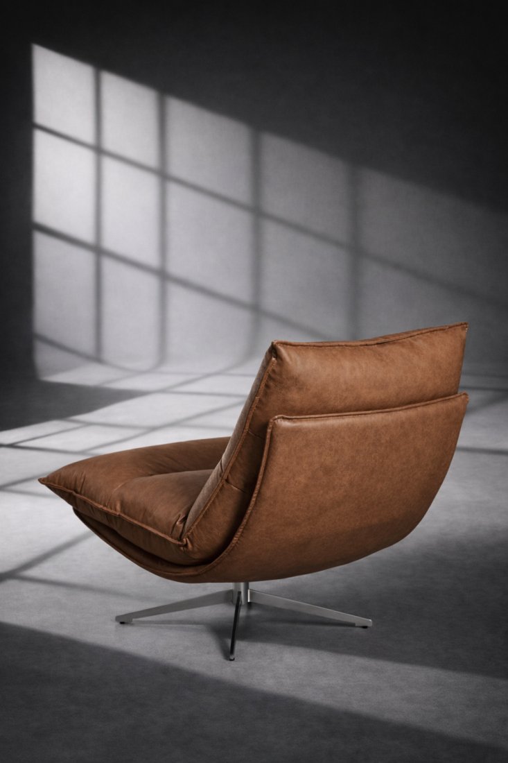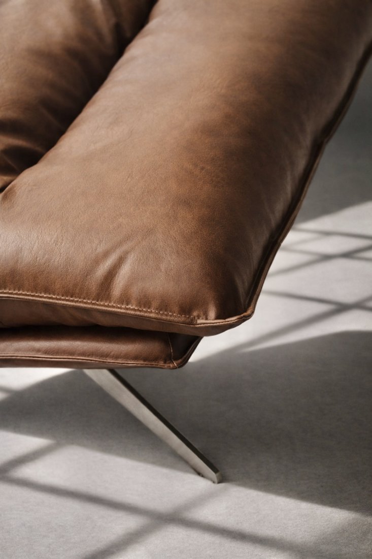 Fotel obity ekoskórą w kolorze brązowym. Jego szerokie, miękkie poduchy otulają ciało, zapewniając idealne warunki do odpoczynku – zarówno podczas czytania, relaksu z kawą, jak i wieczornego seansu filmowego.