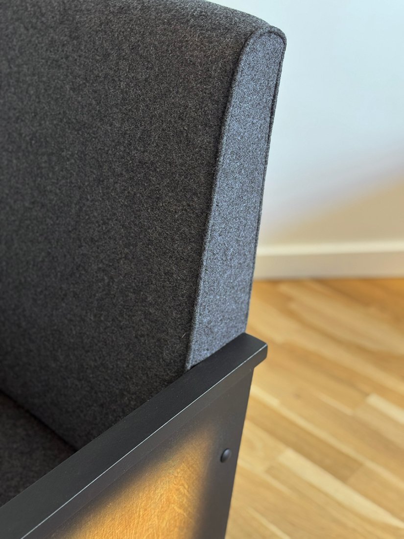 Siedzisko i oparcie tapicerowane są tkaniną Blazer firmy Camira - wysokogatunkową wełną (100%) produkowaną w Wielkiej Brytanii. Kolekcja Blazer należy do najbardziej rozpoznawalnych linii tej marki i ceniona jest za trwałość, naturalny skład oraz charakterystyczną, miękką fakturę. Tkanina ta należy do klasy premium i jest szeroko stosowana w wysokiej jakości projektach meblowych oraz architektonicznych.