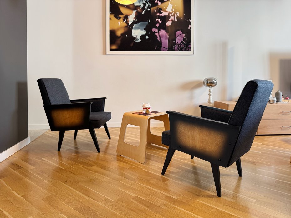 Oryginalny fotel prawdopodobnie z lat 60., poddany starannej renowacji z poszanowaniem jego pierwotnej formy.