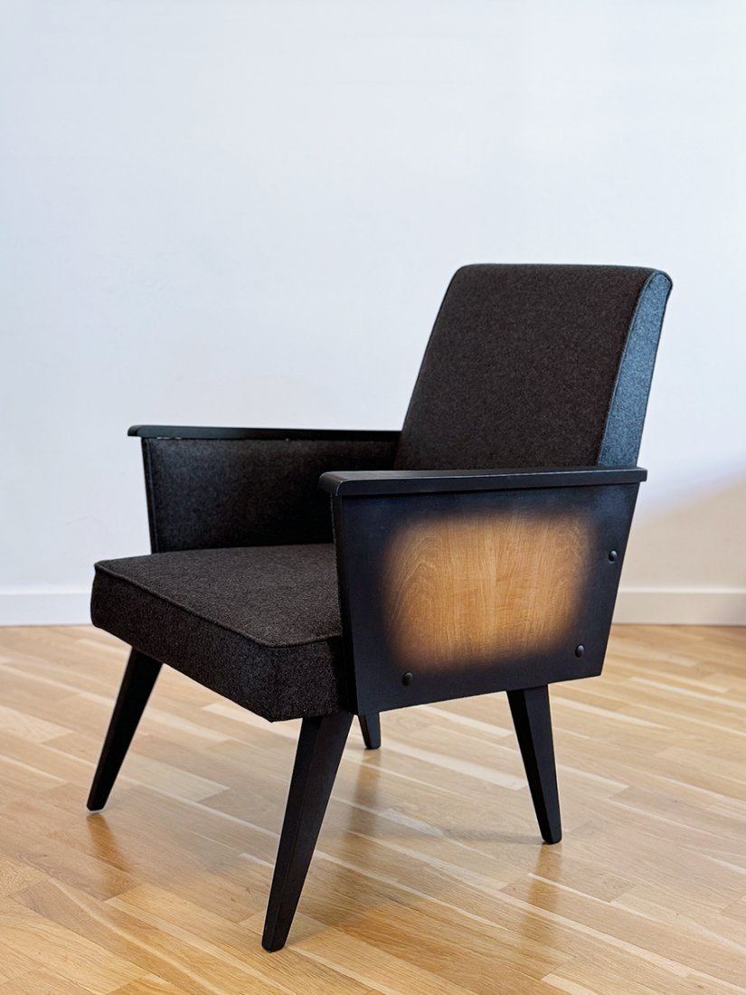 Drewniana konstrukcja została oczyszczona i wykończona w czerni. Ciemne wykończenie z subtelną gradacją odsłania rysunek drewna fornirowanych podłokietników - ślad wcześniejszej historii mebla.