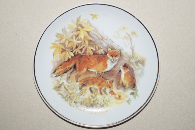 Dekoracyjny talerzyk z kolekcjonerskiej serii WILDLIFE of BRITAIN dla Readers Digest, specjalnie zaprojektowany przez Susan Beresford, ozdobiony półmatowym nadrukiem przedstawiającym lisią rodzinę w jesiennym krajobrazie;), brzeg delikatnie złocony, nie jest to porcelana najwyższej jakości ale jest uroczy:)
