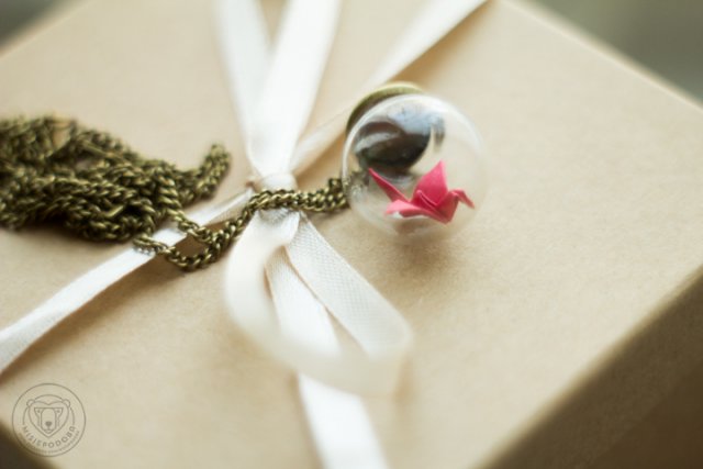 Delikatny, maleńki, papierowy żuraw - japoński symbol szczęścia, zdrowia i pokoju. Podobno, jeśli w jakiejś intencji złoży się tysiąc żurawich figurek, to życzenie się spełni. My spełniamy życzenia tym zjawiskowym wisiorkiem. Papierowy żuraw ukryty w szklanej kuleczce o najszerszej średnicy 2 cm. Część ozdobna zawieszona na łańcuszku o długości 35 cm. Całość w kolorze starego złota/brązu.