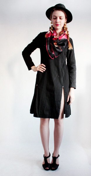 Unikatowa sukienka MADE IN FRANCE. Z przodu dwa suwaki, które umożliwiają modyfikacje fasonu sukienki (można zrobić z niej golf lub sukienkę z glębokim dekoltem). Rozsuwając dwa suwaki i usuwając część materialu pomiędzy nimi można uzyskać cienki plaszczyk.