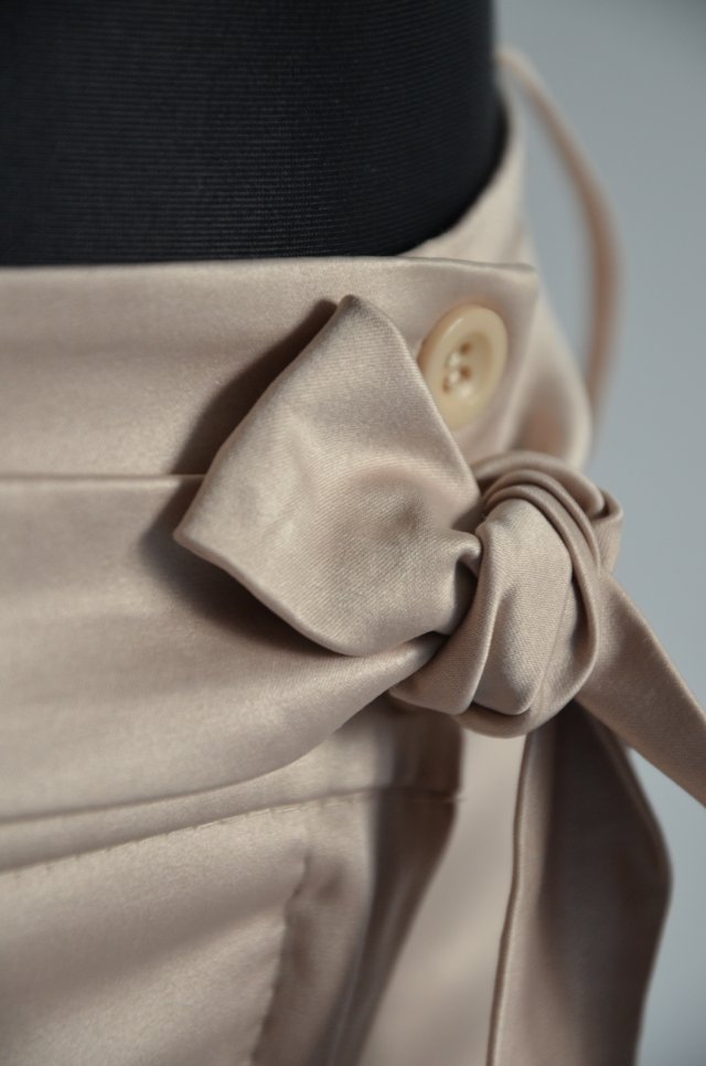 Stylowe satynowe spodenki, francuskie. Beżowe. Szlufki na pasek. W komplecie satynowy pasek. Zapinane na suwak i dwa guziki. Nogawki 3/4. Końce nogawek wiązane.