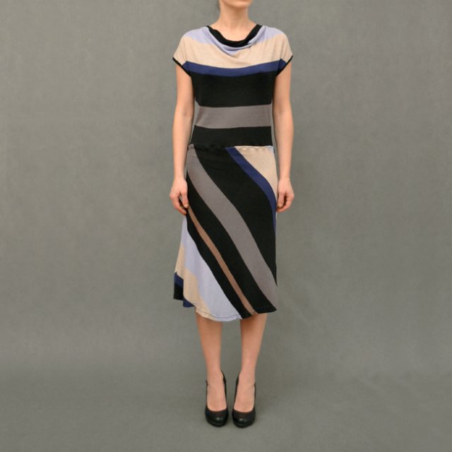 Śliczna sukienka z cieniutkiej dzianiny od Fransa. Góra w poprzeczne pasy, dół w ukośne. W talii odcięta.