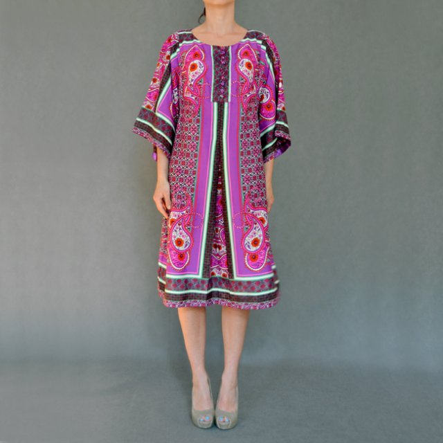 Przepiękna sukienka marki FRANSA w stylu etno/folk. Kolorowa ale w fioletowej dominacji. Rękawki szerokie, krój szerszy i rozszerzający się ku dołowi. Z przodu i z tyłu po środku przechodzi długa kontrafałda. Można nosić z paskiem. Polecam.
