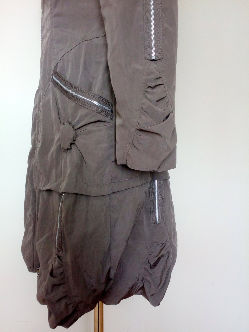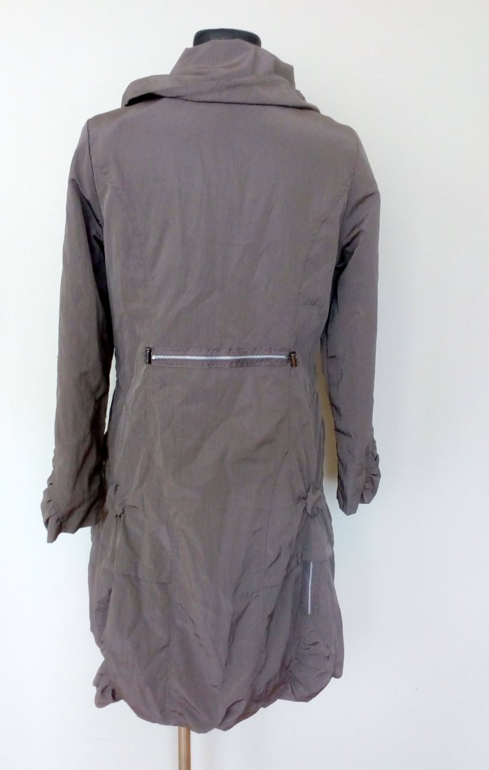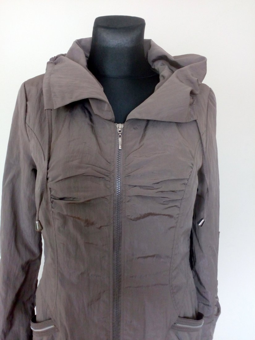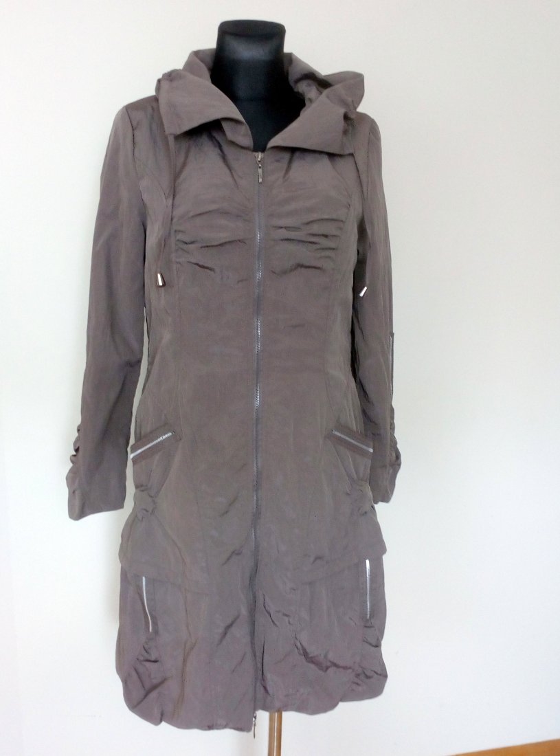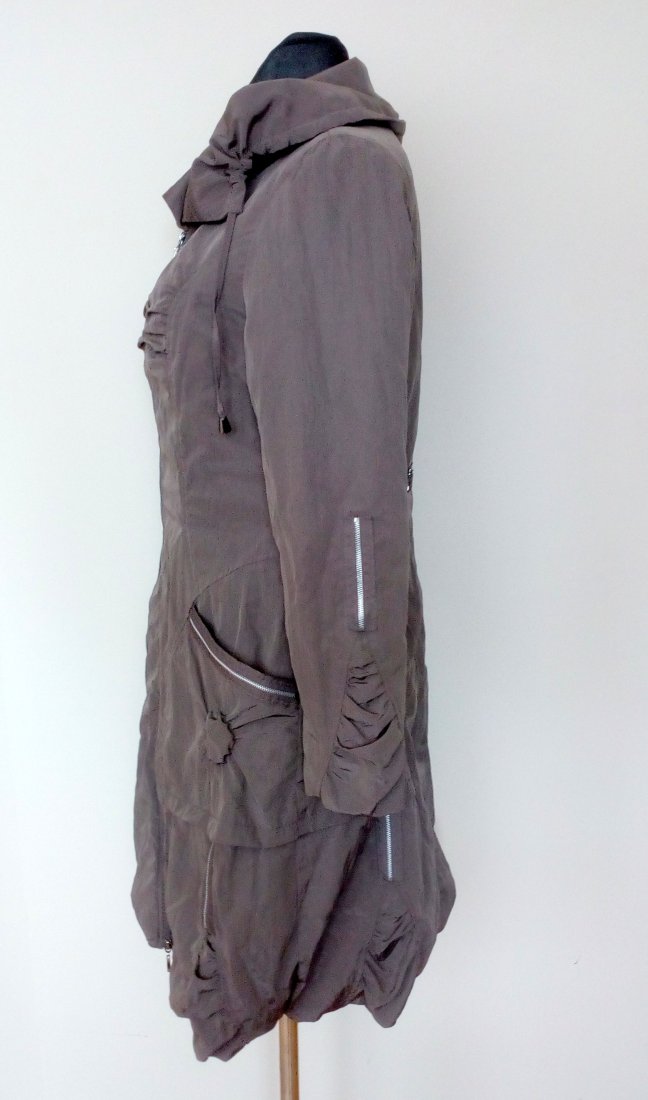 Ciekawy płaszcz wiosenno/jesienny, kolor brązowy, zapinany na podwójny zamek, zdobiony drapowaniami i naszywanymi zamkami, kołnierz ściągany sznurkiem ze stoperami, z przodu naszywane kieszenie, dół płaszcz lekko bombkowaty, od środka lekko ocieplany cienkim polarem
