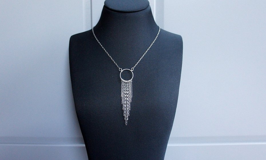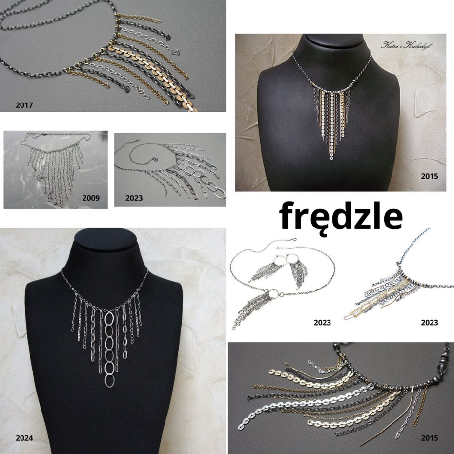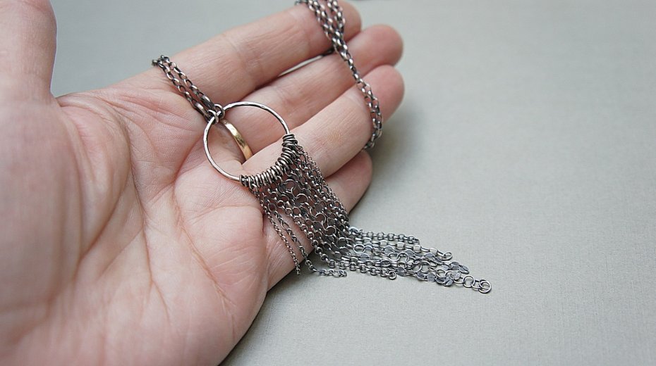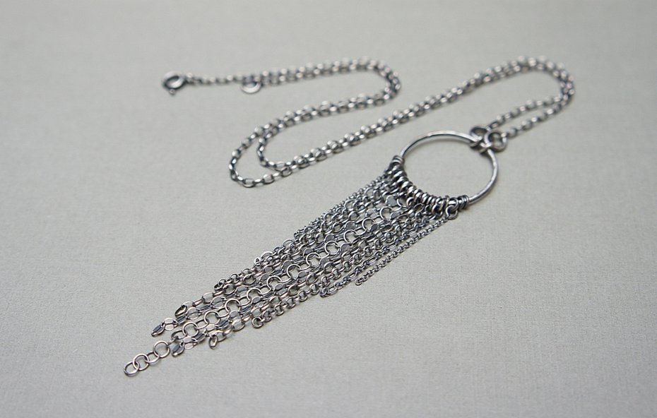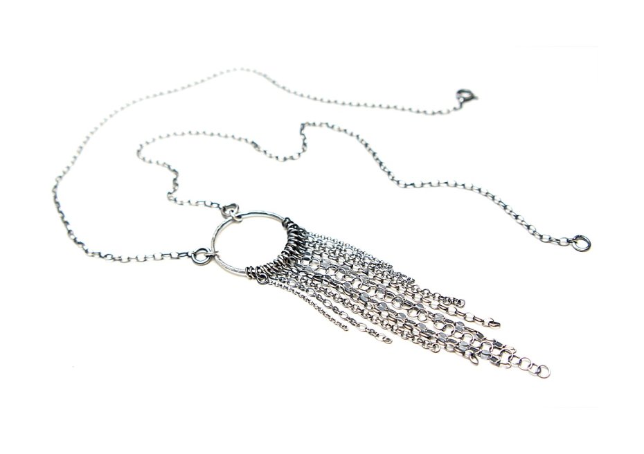Naszyjnik wykonany od podstaw ze srebra [pr. 925] w połączeniu z różnej długości łańcuszkami o różnych wielkościach ogniw. Całość oksydowana i przetarta. Całkowita długość naszyjnika 50cm.Długość części wiszącej 10,5cm .Średnica koła /19mm/. Biżuteria ozdobnie zapakowana.
