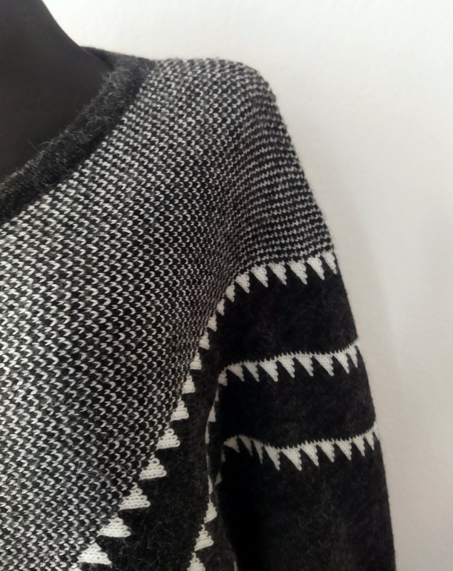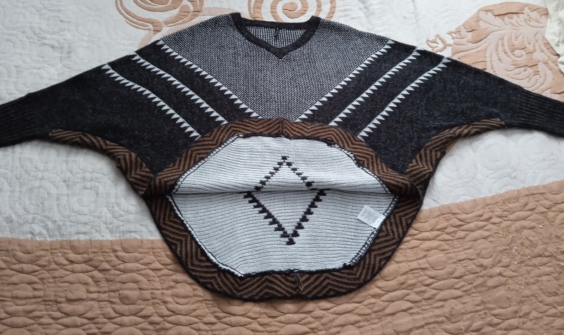 Wzorzysty sweter o ciekawym kroju stylizowany na poncho z akrylowej włóczki z domieszką wełny i poliamidu w kolorze melanżowej czerni z wzorami w białym i karmelowym kolorze. Fason lekki nietoperz zaokrąglony dołem z rozcięciami po bokach od pach, rękawy bez szwów przyramiennych zwężane do dołu wykończone ściągaczami. Ładniejszy w realu