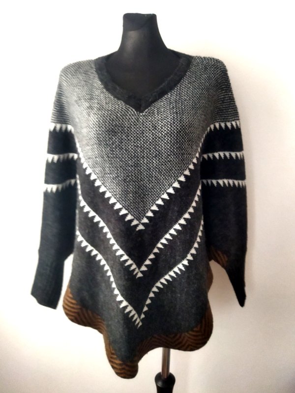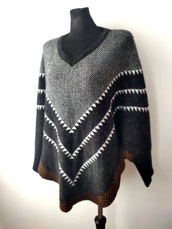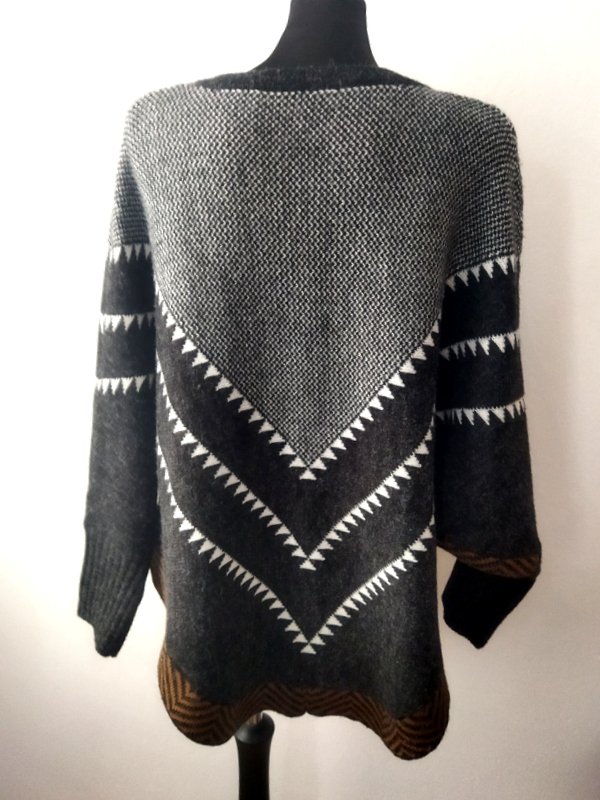 Wzorzysty sweter o ciekawym kroju stylizowany na poncho z akrylowej włóczki z domieszką wełny i poliamidu w kolorze melanżowej czerni z wzorami w białym i karmelowym kolorze. Fason lekki nietoperz zaokrąglony dołem z rozcięciami po bokach od pach, rękawy bez szwów przyramiennych zwężane do dołu wykończone ściągaczami. Ładniejszy w realu