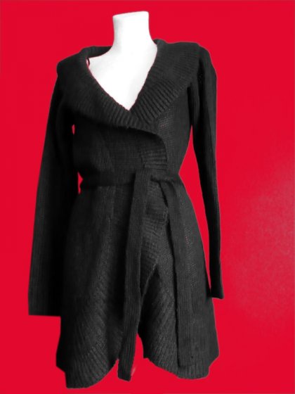Nowy, nie używany sweter. Na zakładkę, zawiązywany w pasie paskiem. Wykończony falbaną.Z przodu krótszy.