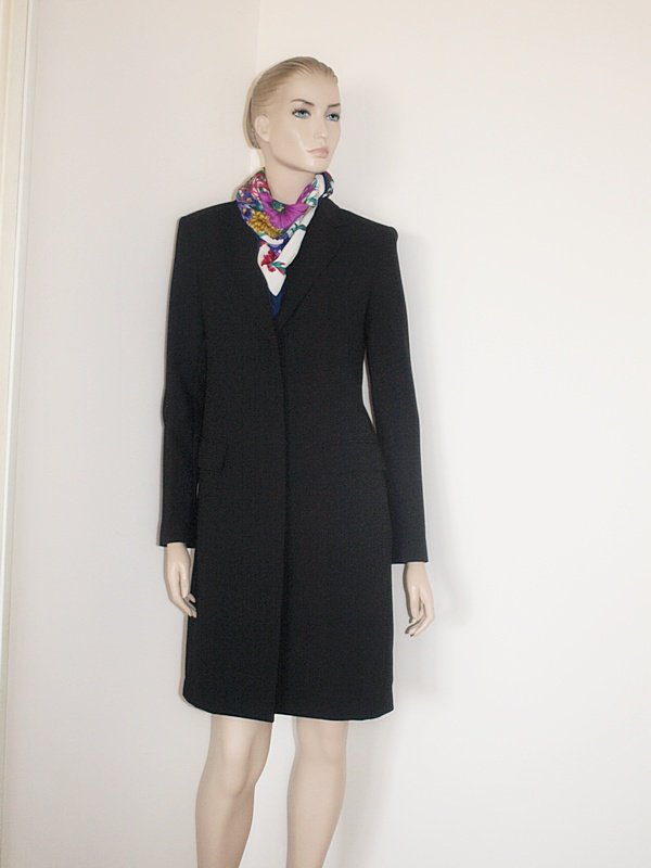 przepiękny czarny, płaszczyk bądź długi żakiet ekskluzywnej marki french connection. Materiał 43% wełna, 53% poliester 4% elastan. Niezwykle elegancki i świetnie odszyty. Bez podszewki. Taliowany, zapinany na kryte guziki. Stan bardzo dobry, prawdopodobnie nieużywany, kieszenie zaszyte. Na dole z tyłu rozcięcie. Rozmiar z metki 10, na manekinie o rozmiarze 38. Podaję wymiary mierzone na płasko;