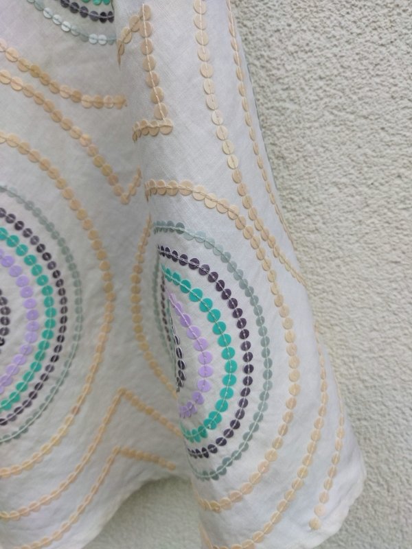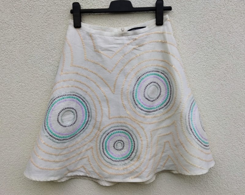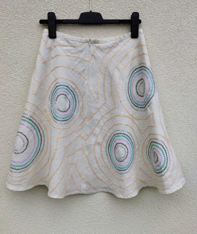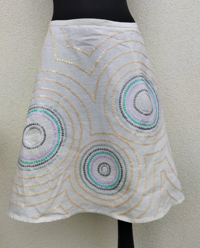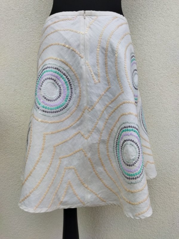 Piękna trapezowa spódnica cięta z ukosa z tkaniny z naturalnych włókien ramie haftowana cekinami w pastelowych kolorach. Zapinana z tyłu na zamek. Na bawełnianej podszewce