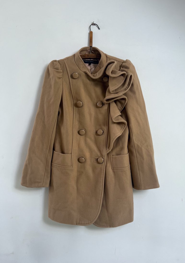 Kamelowy płaszcz zapinany na guziki, z ozdobną falbaną, przy rękawach bufki. Stan bdb.