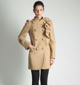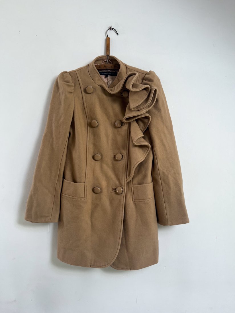 Kamelowy płaszcz zapinany na guziki, z ozdobną falbaną, przy rękawach bufki. Stan bdb.