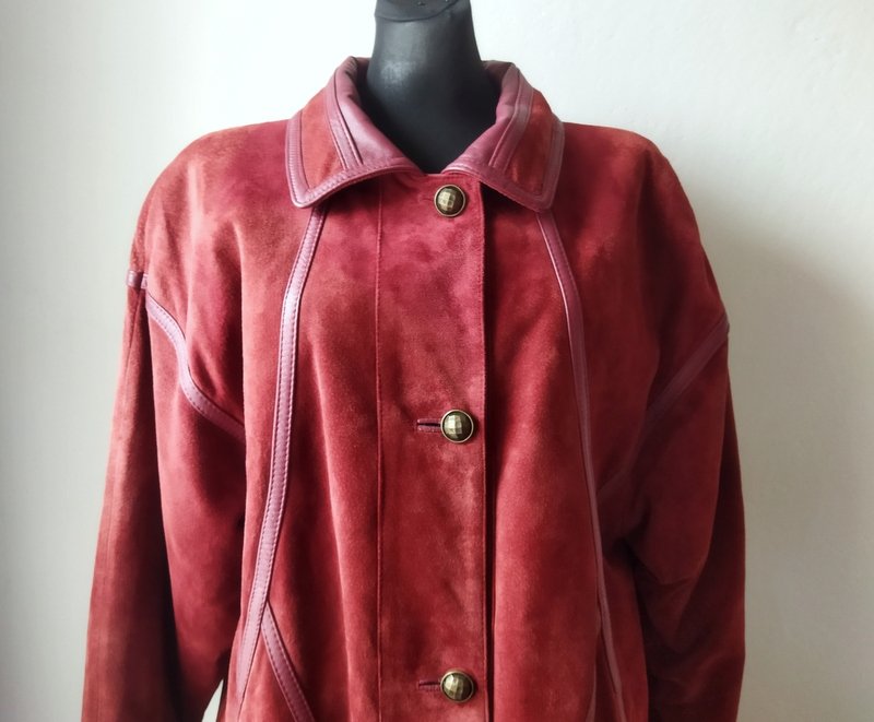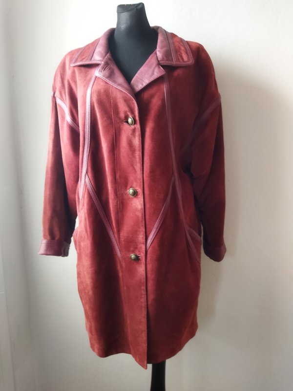 Ocieplany skórzany płaszcz lub dłuższa kurtka z zamszowej skóry naturalnej w kolorze zgaszonej czerwieni, elementy wykończeniowe:( podszycia, naszywane lamówki) - ze skóry licowej w tym samym kolorze. Poszerzana do dołu, z dwiema wpuszczanymi kieszeniami, rękawy raglanowe. zapinana na wypukłe metalowe guziki w kolorze starego złota. całość na podszewce.