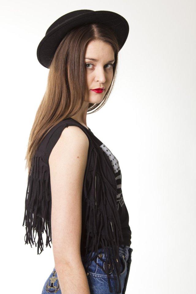 Czarna, krótka kamizelka z frędzlami i umieszczonymi gdzieniegdzie łańcuszkami.