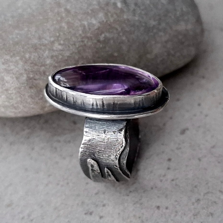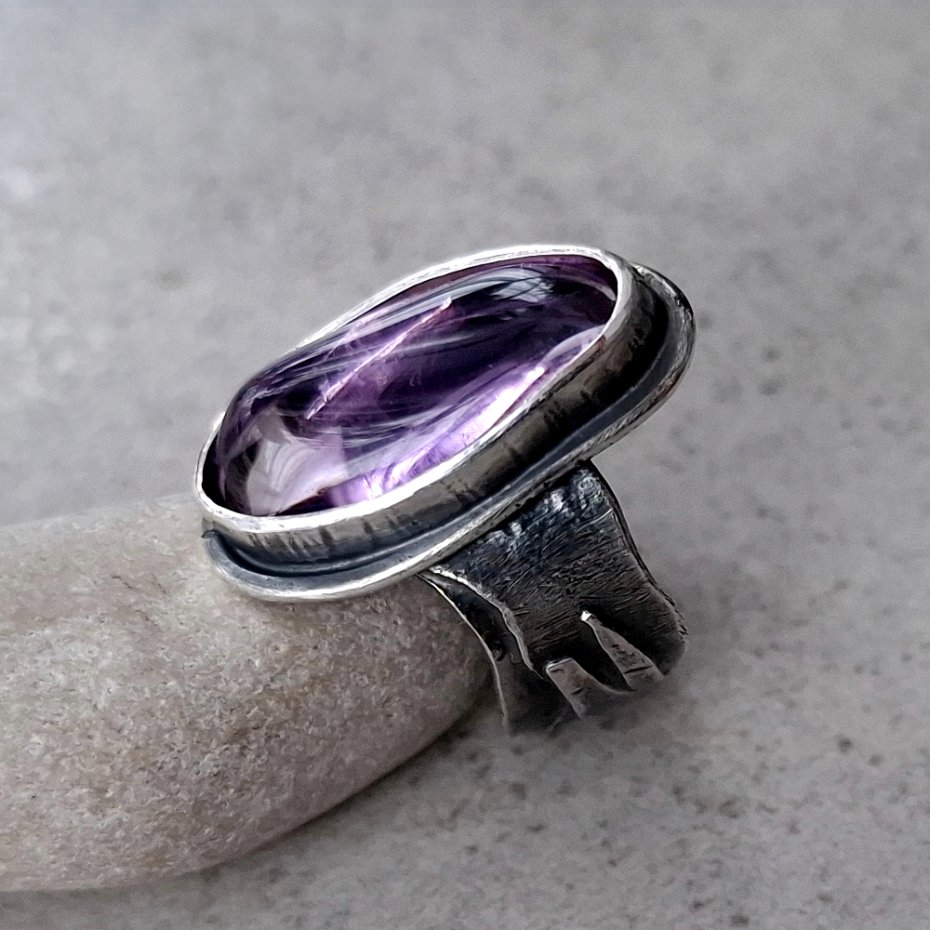 Okazały, fantazyjny, baśniowy, srebrny pierścień ozdobiony ametrynem. Pierścień w formie szerokiej wstęgi oplatającej cały palec dostosowuje się do rozmiaru. Srebro postarzane, mocno zoksydowane. Całość wykonana ręcznie ze srebra 925 w jednym niepowtarzalnym egzemplarzu. Szerokość ozdobnej obrączki w najszerszym miejscu: ok 9 mm, rozmiar korony pierścionka ok 12x24 mm. Rozmiar obrączki regulowany. Biżuteria zostanie ozdobnie zapakowana.