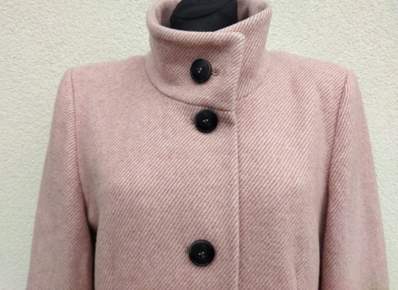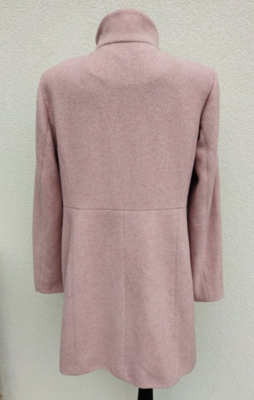 Wspaniały płaszcz lub dłuższa kurtka z wełnianej tkaniny z domieszką w kolorystyce weneckiego różu i złamane bieli. Odcinany w pasie , z kołnierzem typu wyższa stójka , dół z dwiema zakładkami po jednej z każdego boku , z dwiema wpuszczanymi kieszeniami . zapinany na guziki . Całość na podszewce