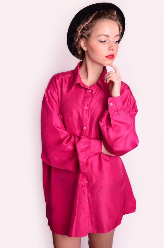 Jedwabna koszula w kolorze fuksji, zapinana na guziki z przodu. Posiada dwie kieszonki na biuście oraz kołnierzyk.