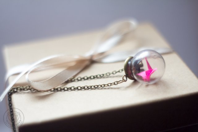 Delikatny, maleńki, papierowy żuraw - japoński symbol szczęścia, zdrowia i pokoju. Podobno, jeśli w jakiejś intencji złoży się tysiąc żurawich figurek, to życzenie się spełni. My spełniamy życzenia tym zjawiskowym wisiorkiem. Papierowy żuraw ukryty w szklanej kuleczce o najszerszej średnicy 2 cm. Część ozdobna zawieszona na łańcuszku o długości 37 cm. Całość w kolorze starego złota/brązu.
