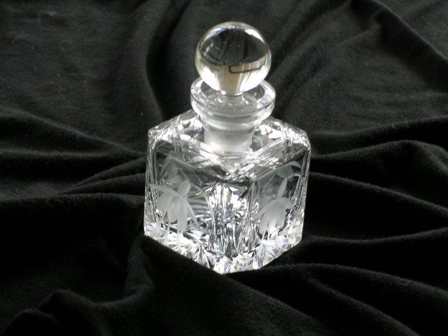 Piękna niewielka karafko-buteleczka dawnej daty, z duszą, wielce elegancka. Doskonała (i użytkowa) ozdoba toaletki, łazienki, kuchni... Do zastosowania wg uznania, ale zawsze z przyjemnością obcowania, bo kryształ czysty, światłolubny... no i ta kulka (najpewniej dopasowana, nie oryginalna). Całość urzeka :) 5,5 x 5,5 x 10 cm. Stan zachowania bardzo dobry.