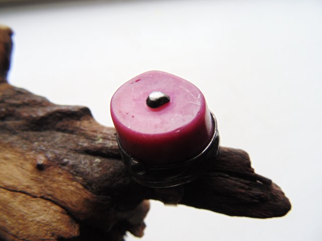 Pierścionek wykonany techniką witrażową z koralowca w kolorze fuksji. Obrączka posrebrzana, regulowana. Średnica ok. 2 cm.