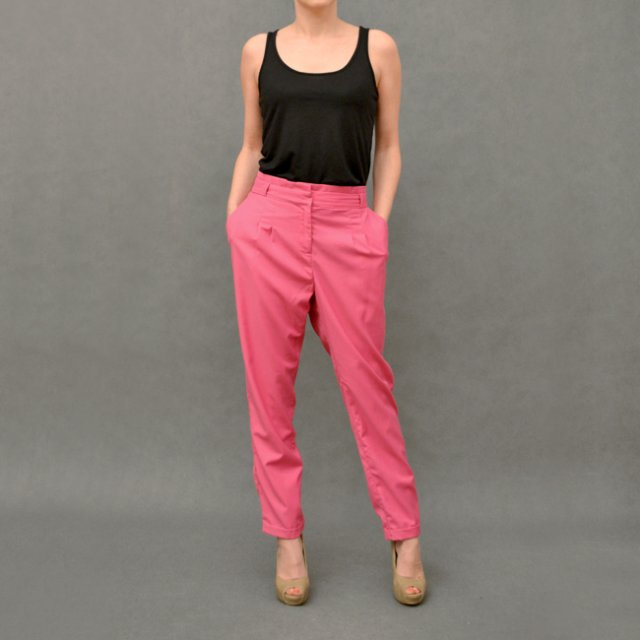 Świetne spodnie w cudnym fuksjowym kolorze od H&M. Krój zwężany z podwiniętymi mankietami. W talii szlufki, po bokach kieszenie.