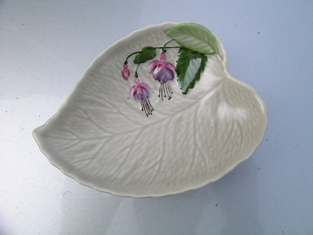 Ciekawy i dekoracyjny Niewielki Półmiseczek sygnowany CROWN DEVON MADE IN ENGLAND. Forma liścia z odwzorowaniem żyłek liściowych i kwiatami fuksji. Starej daty rzecz. Urodziwa wielce. Satynowe wykończenie beżowego tła. Kolory kwiatów i liści autentyczne satynowo-błyszczące.