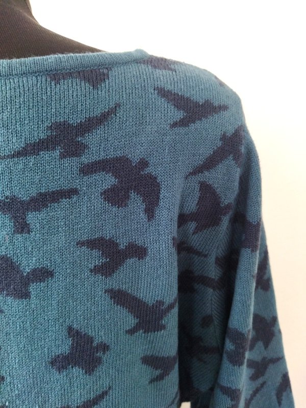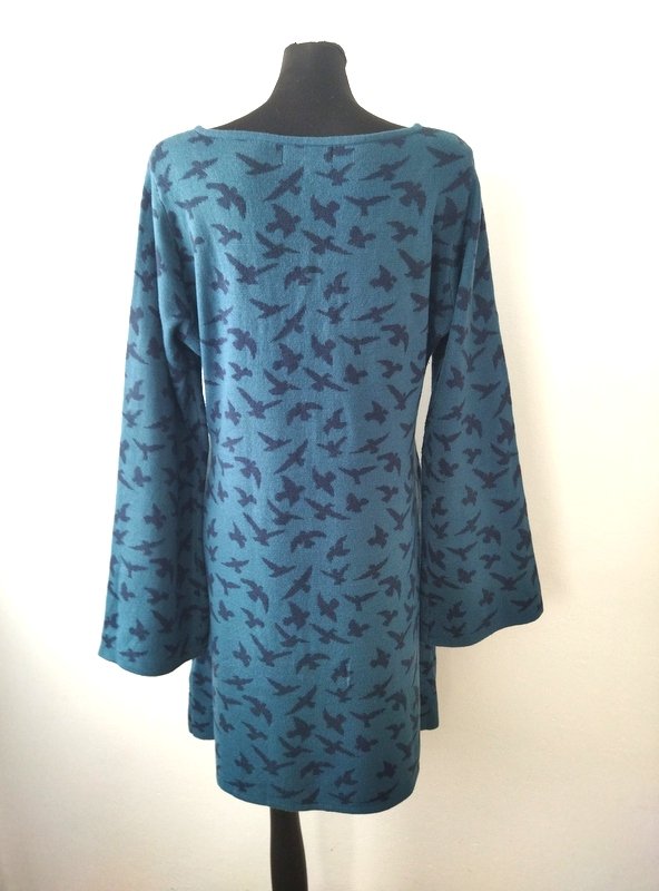 Sukienka z masywnej ale miękkiej dzianiny z akrylu w morskim kolorze z czarnymi i białymi mewami. Wciągana - bez zamka, dekolt w serek, rękawy dzwonkowate poszerzane do dołu.