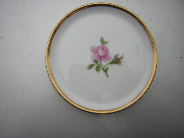 Porcelanowy Talerzyk -podstawek tzw. Konfiturówka z renomowanej wytwórni porcelany FURSTENBERG V - GERMANY . Sygnowany rowniez numerycznie 02 274 i 21 . Biała porcelana, subtelne, eleganckie różane zdobienie. Rant złocony. Wykończenie satynowo - błyszczące. Wzór satynowy. Forma nieco bardziej płaska niż większość Konfiturówek Furstenberga.