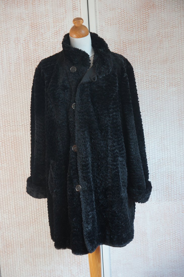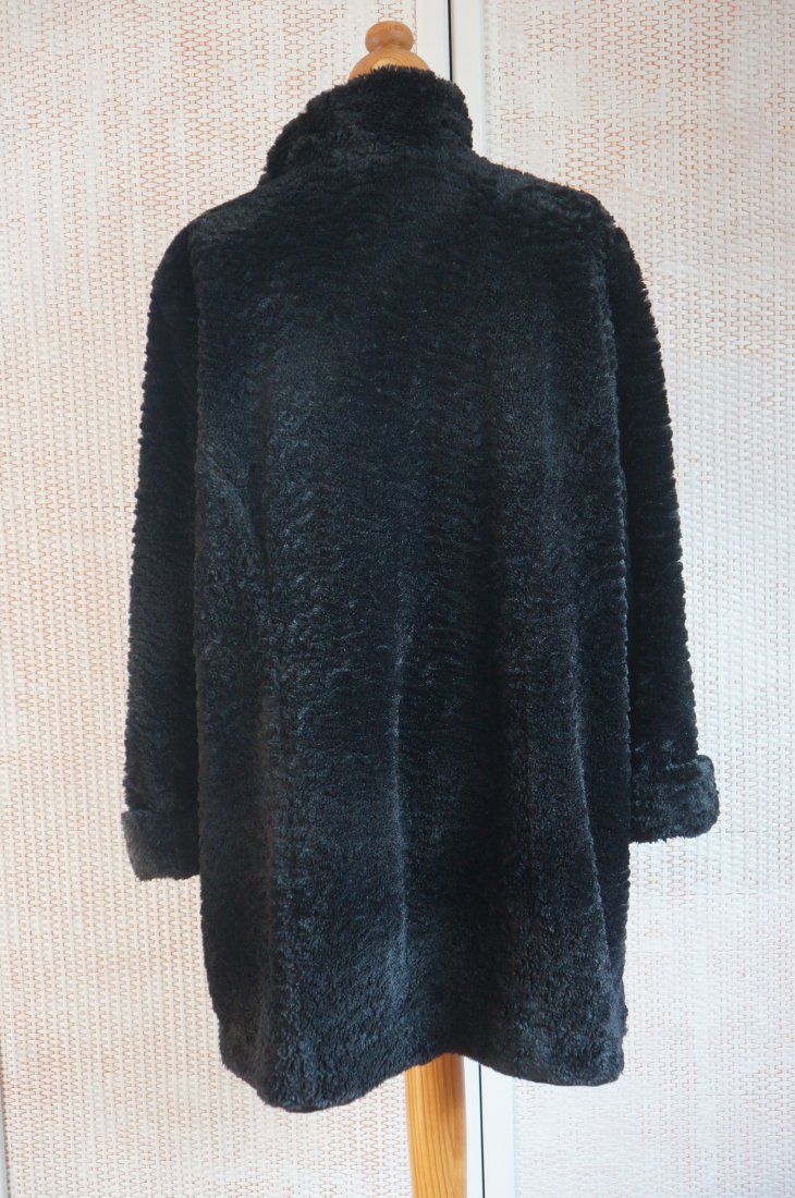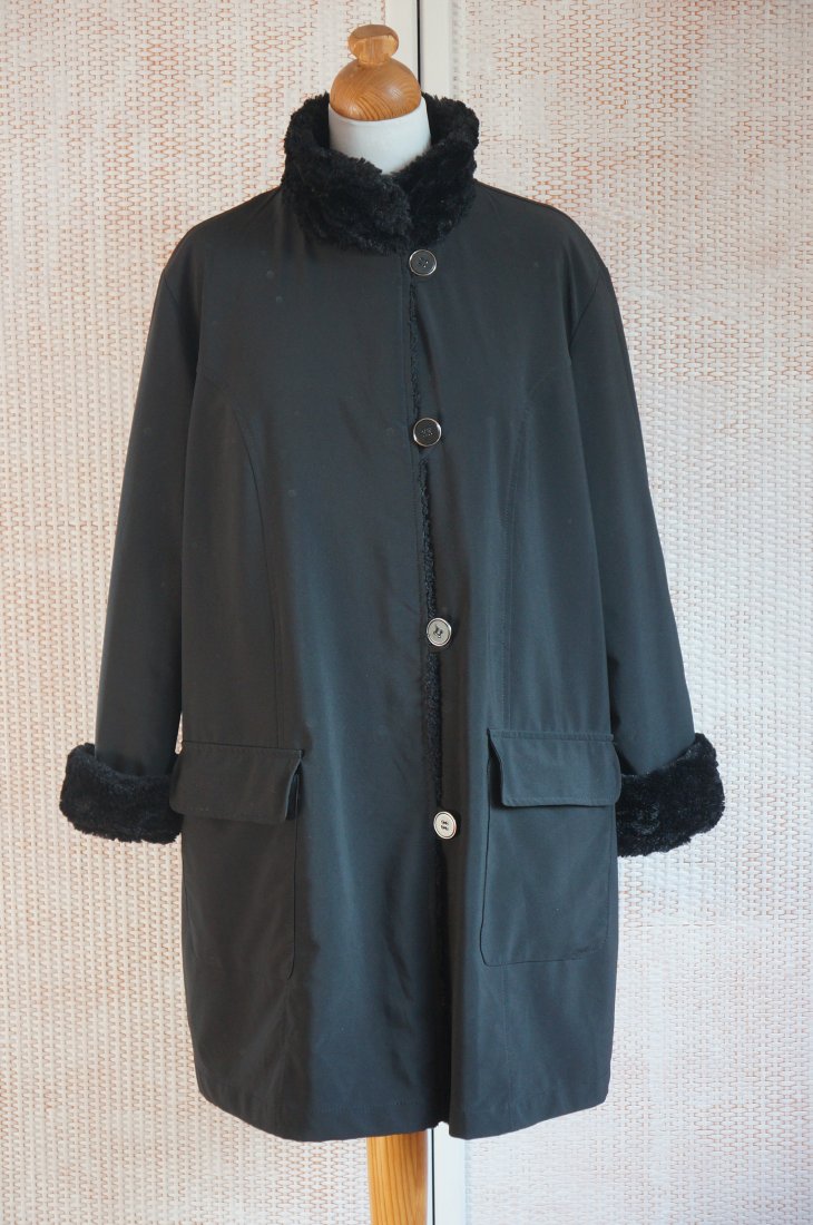 Dwustronna kurtka / płaszczyk. Kolor czarny. Zapinana na guziki. Przy szyi stójka o wysokości 9 cm. Rękawy zakończone wywiniętym mankietem.