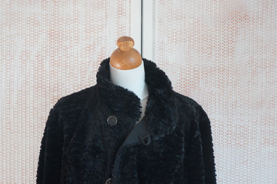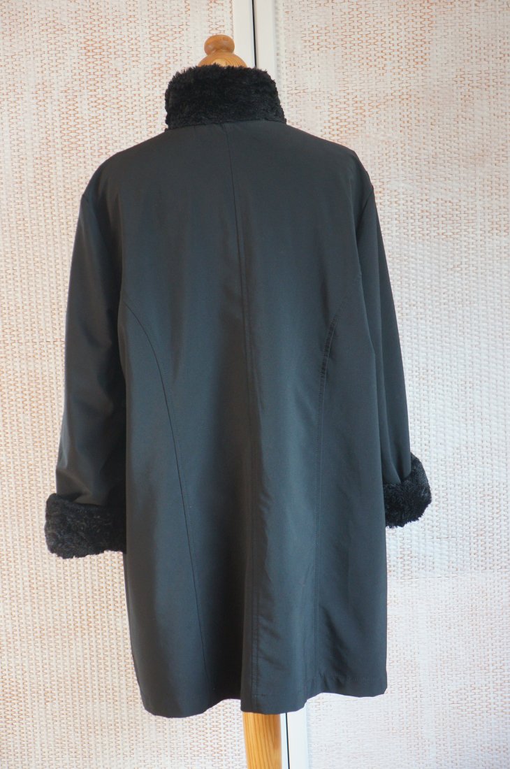 Dwustronna kurtka / płaszczyk. Kolor czarny. Zapinana na guziki. Przy szyi stójka o wysokości 9 cm. Rękawy zakończone wywiniętym mankietem.