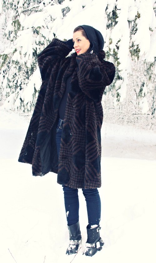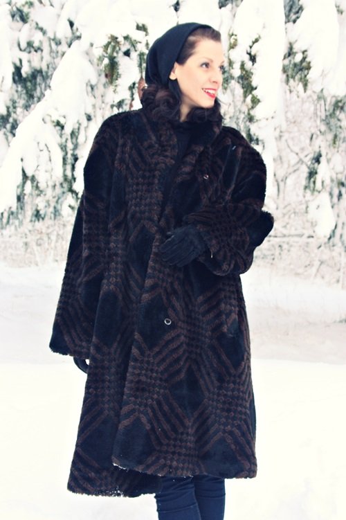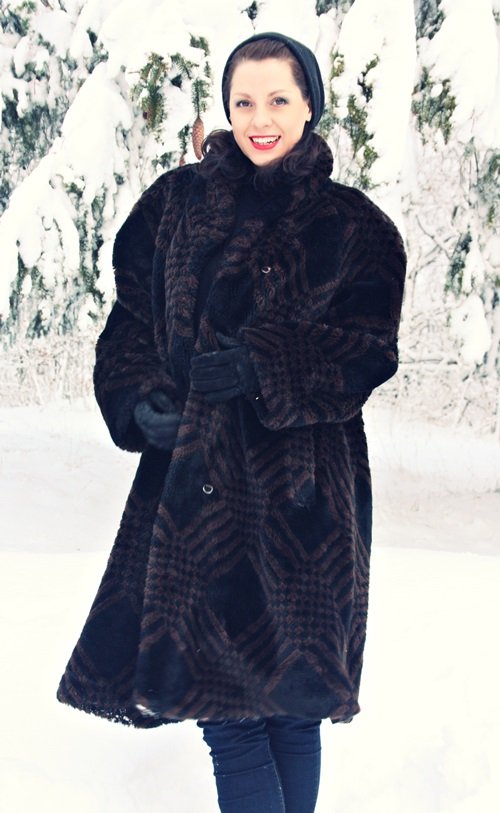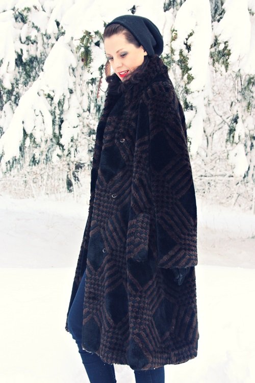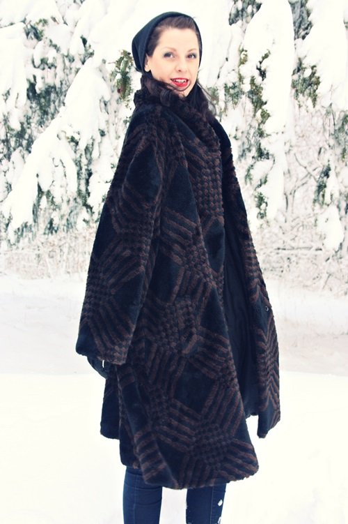 Lekkie, sztuczne futro, rękaw reglan. Rozkloszowane ku dołowi, zapinane na trzy haftki. Po bokach kieszenie. Stan bdb.