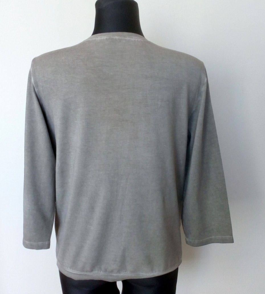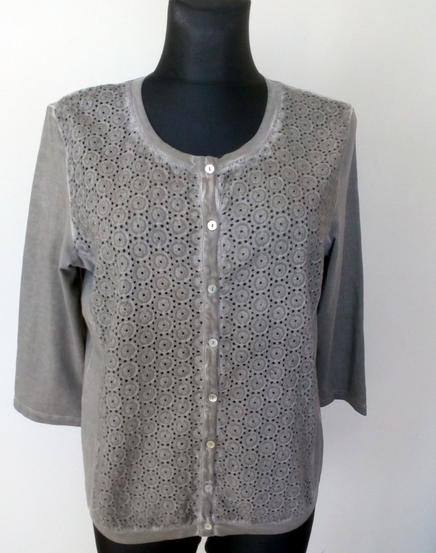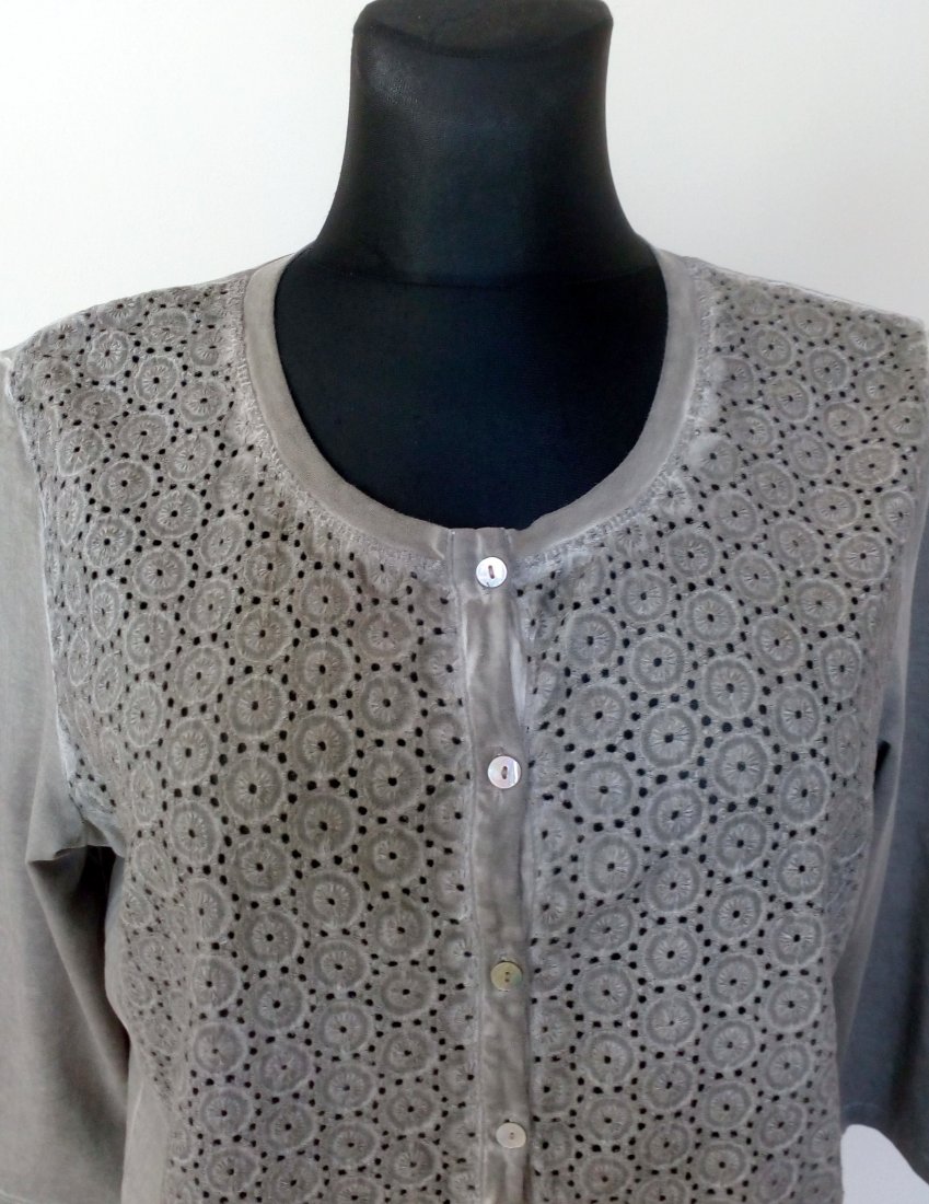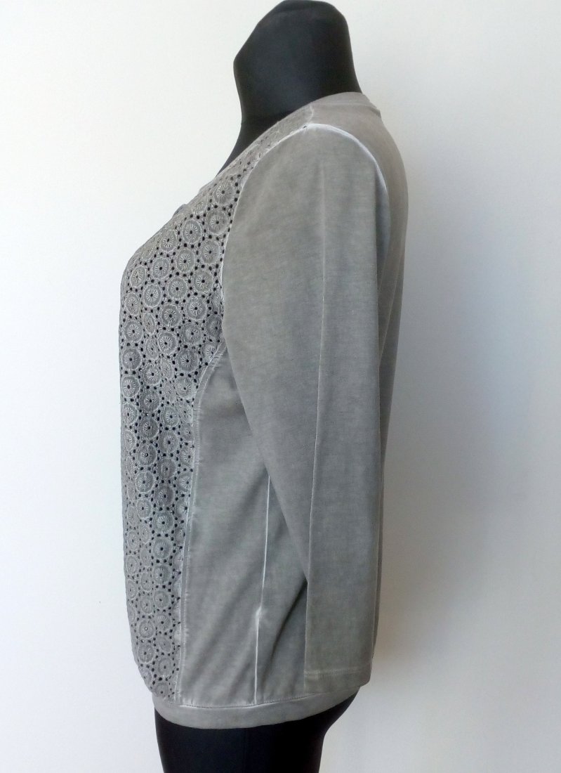 Dekatyzowana bluzka z łączonych materiałów, przód z haftowanej tkaniny, reszta dzianinowa, rękaw 3/4