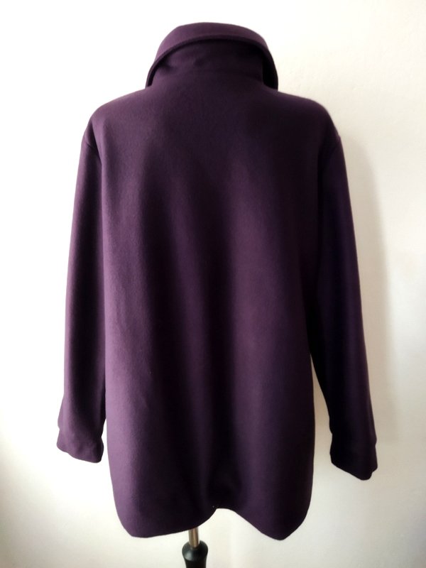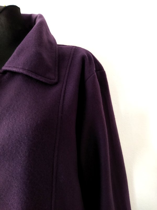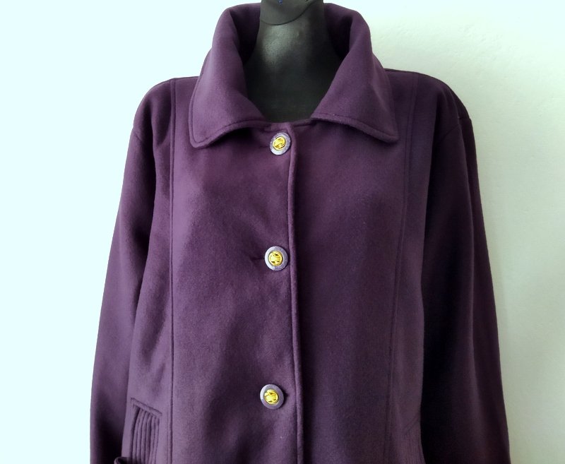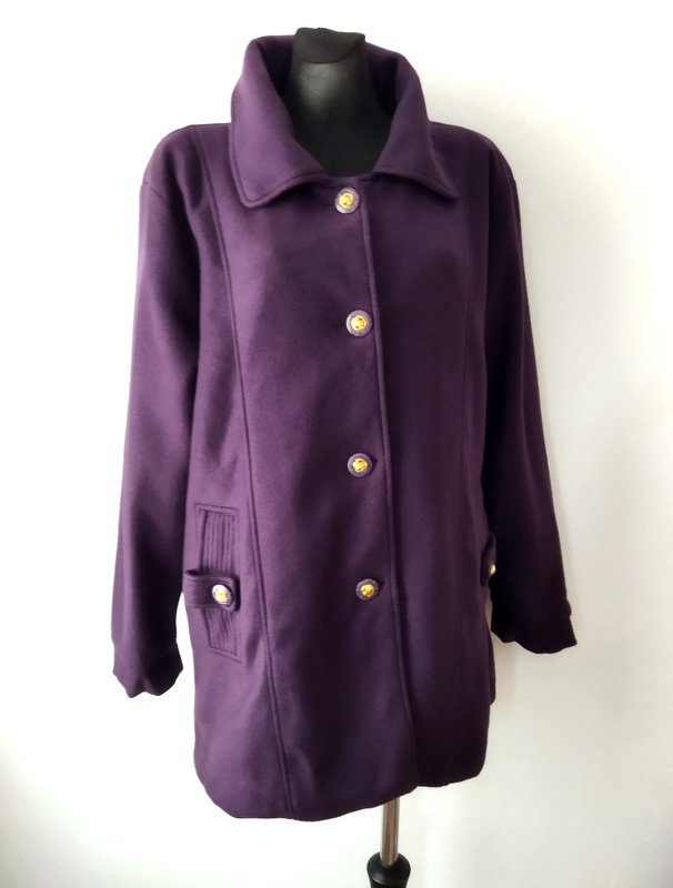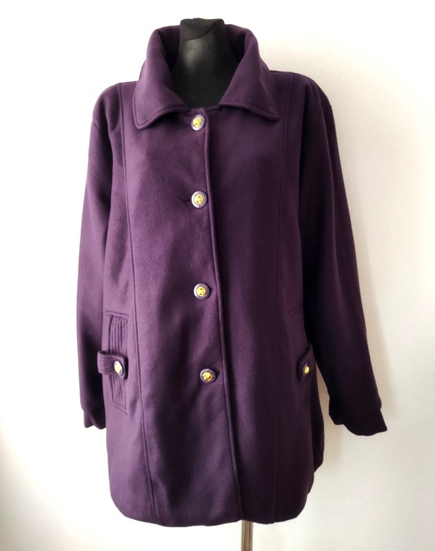 Kurtka z flauszowej tkaniny w fioletowo-śliwkowym, kolorze. Lekko taliowana z kołnierzem, z dwiema wpuszczanymi kieszeniami. Zapinana na ozdobne biżuteryjne guziki. Całość na podszewce w kolorze tkaniny wierzchniej.