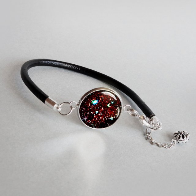 Bransoletka z unikatową grafiką artystyczną umieszczoną pod wypukłym szkłem tzw. kaboszonem, dającym efekt trójwymiarowości i oprawioną w hipoalergiczną bazę w kolorze srebrnym. Oczko z grafiką przymocowane do czarnego rzemienia ze skóry naturalnej. Zapięcie posrebrzane, hipoalergiczne. Unikatowe szklane kaboszony z grafiką wykonane są ręcznie według mojego projektu, z dbałością o każdy detal. Biżuteria nie zawiera niklu i ołowiu.