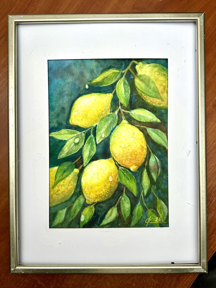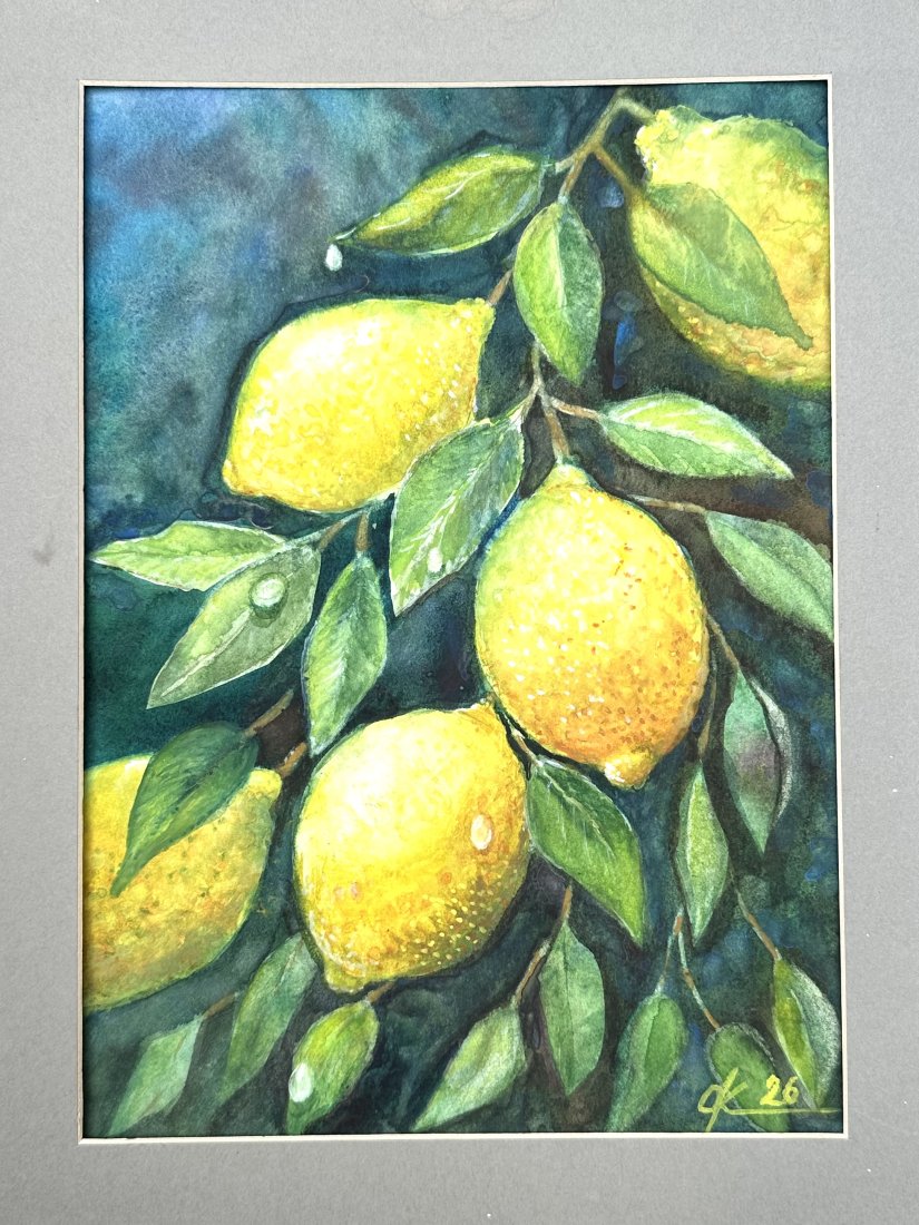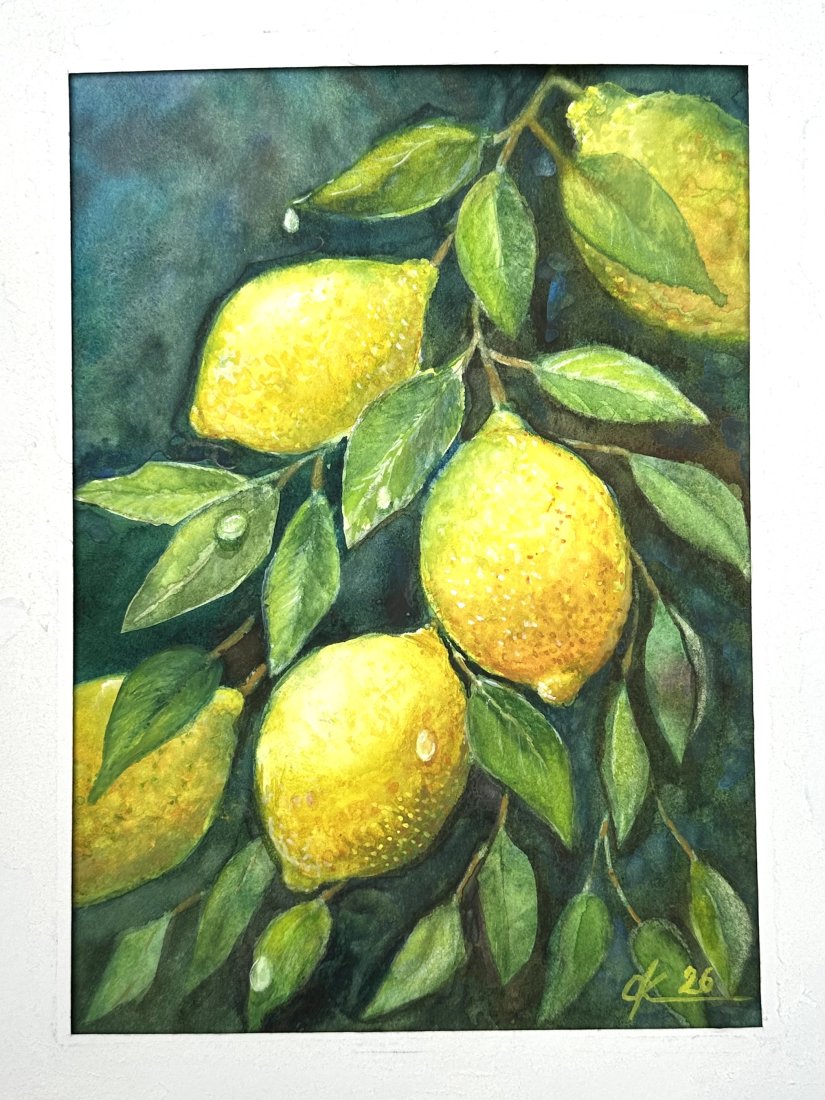 Tagi: #akwarelowy krajobraz, #cytrynowy, #gałązka cytryny, #original akwarela