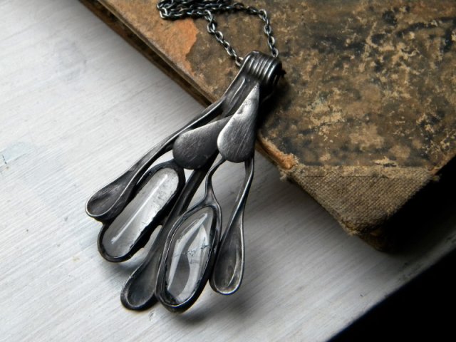 naszyjnik. zawieszka z kryształów górskich oprawionych w ocynowaną miedz. długość zawieszki 7cm, szerokość 4,2cm. łańcuszek z oksydowanej miedzi o długości 70cm. przedmiot stylizowany na stare srebro.