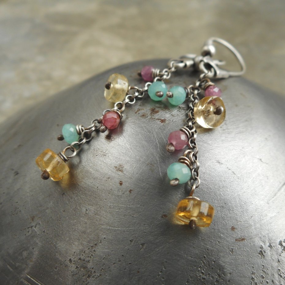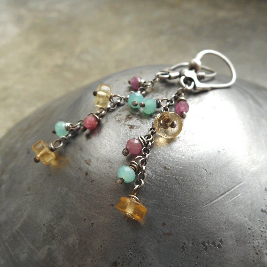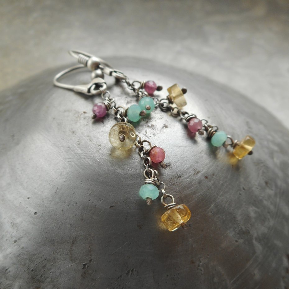 Stylowe kolczyki z kamieni naturalnych i szlachetnego srebra, wygodne, wiszące, w formie gałązek ozdobionych szeregiem pięknych minerałów.