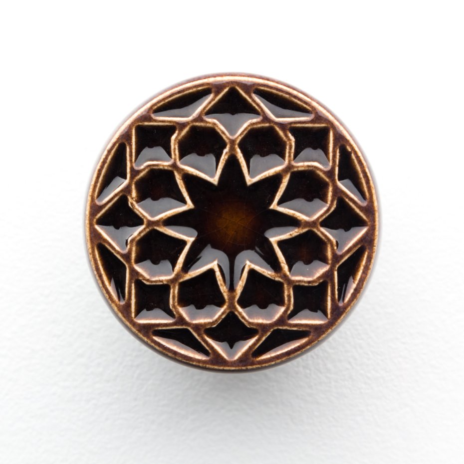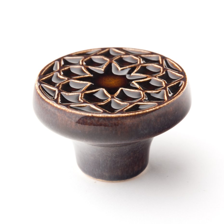 Ceramiczna gałka do mebli – ręcznie wykonana, ornamentowa, wg własnego projektu. Wykonana z jasnej gliny, pokryta błyszczącym szkliwem.
