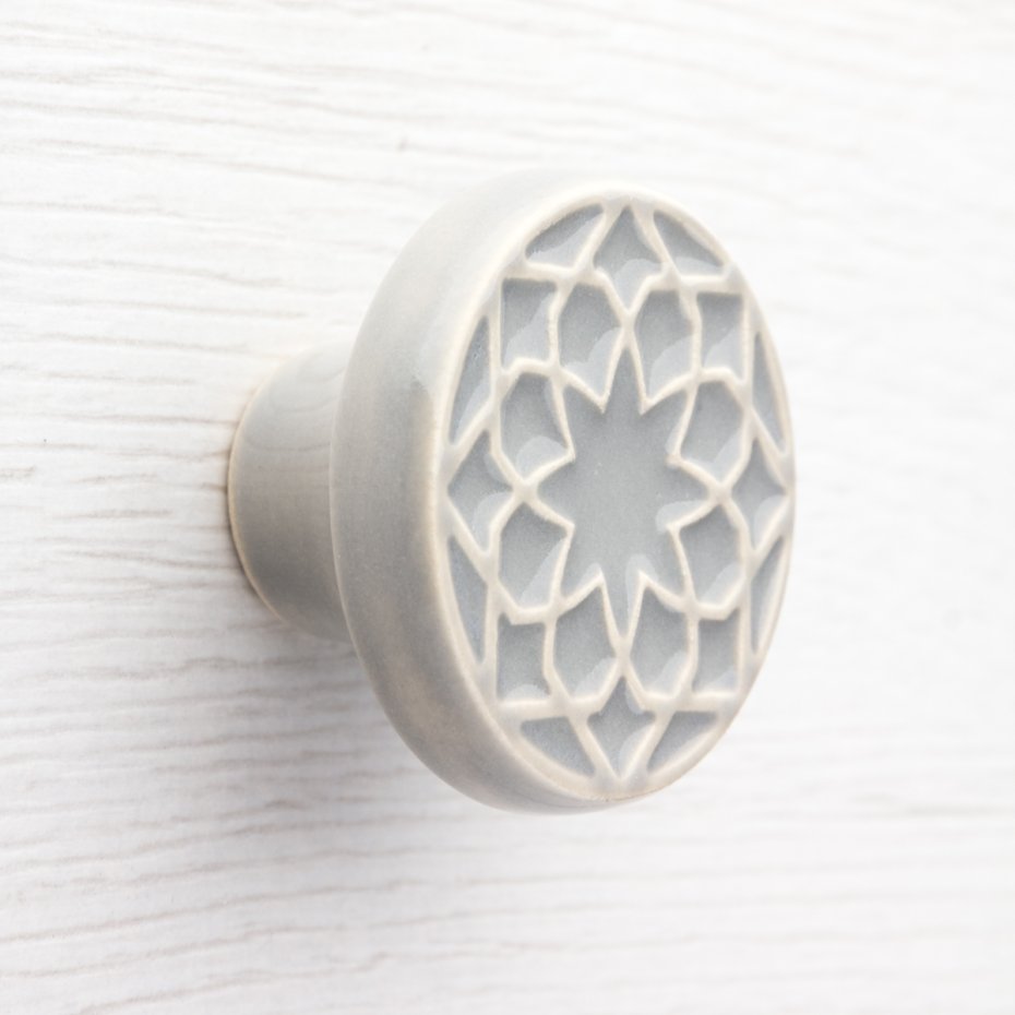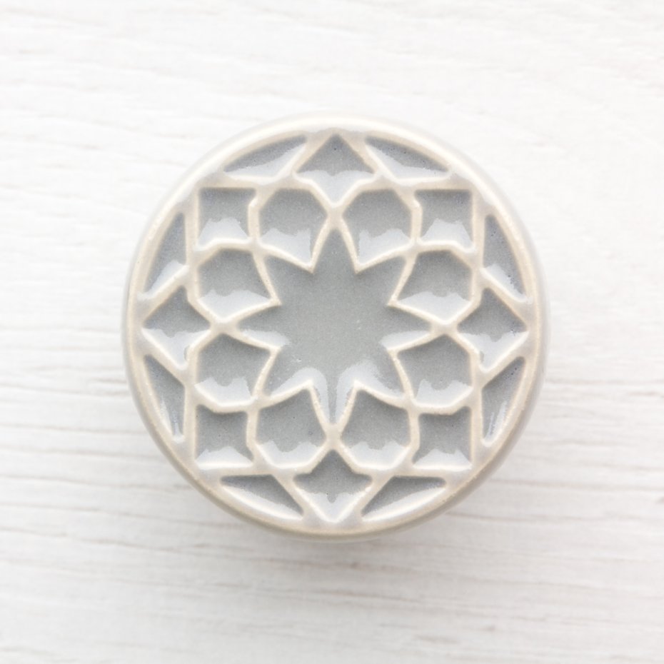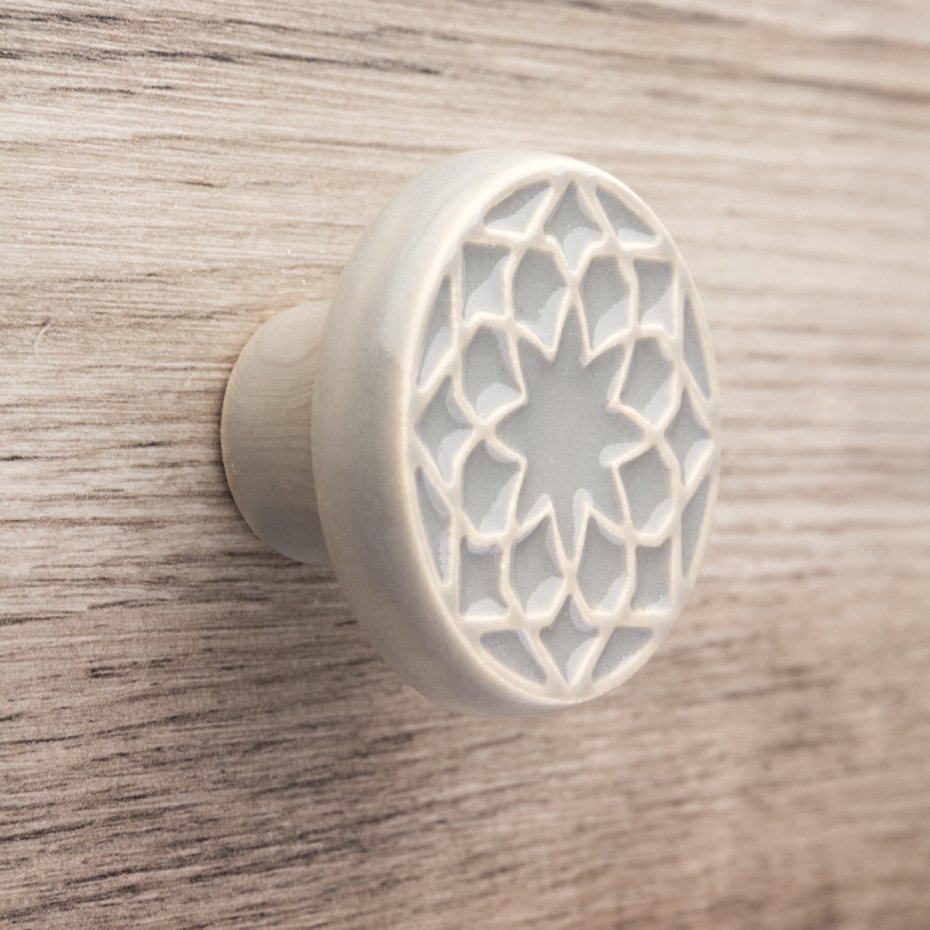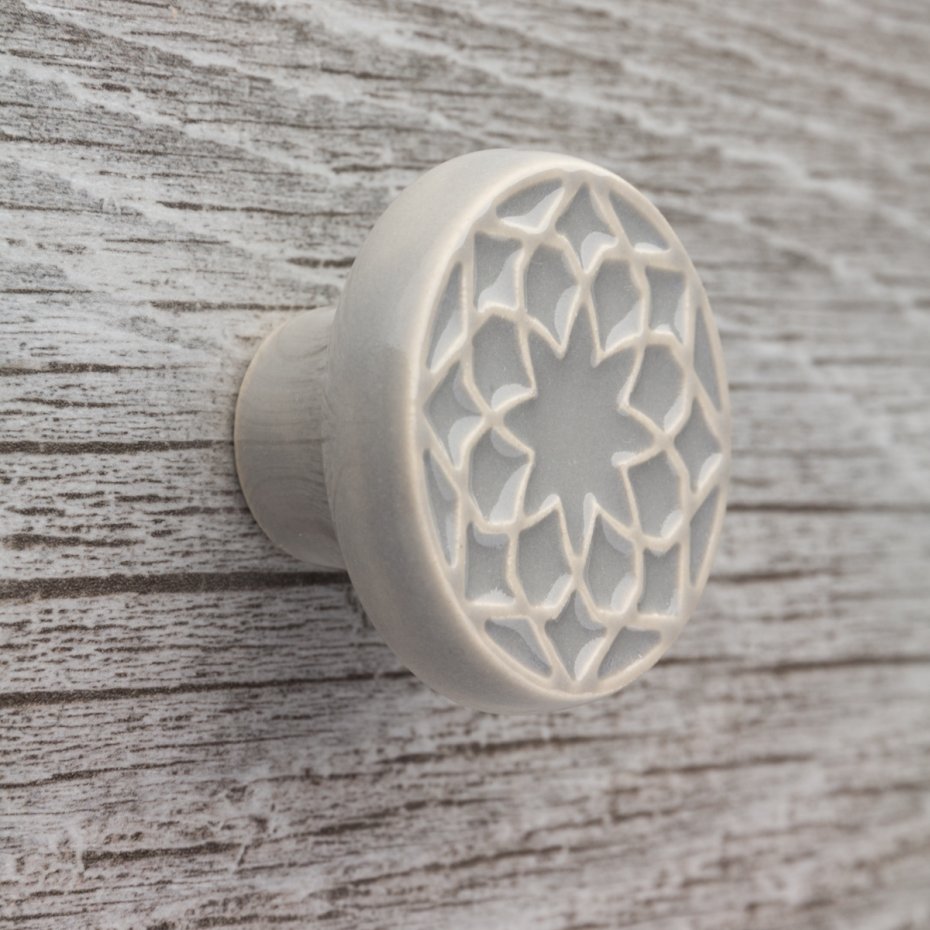 Ceramiczna gałka do mebli – ręcznie wykonana, ornamentowa, wg własnego projektu. Wykonana z jasnej gliny, pokryta błyszczącym szarym szkliwem.